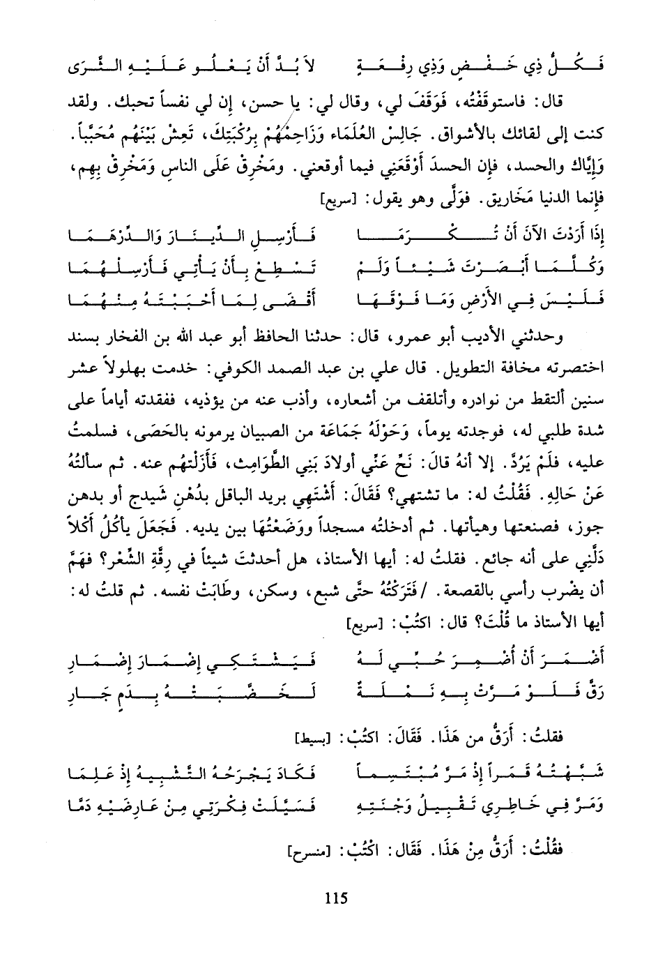 فقلت: أرقّ من هذا. فقال: اكتب: [بسيط]