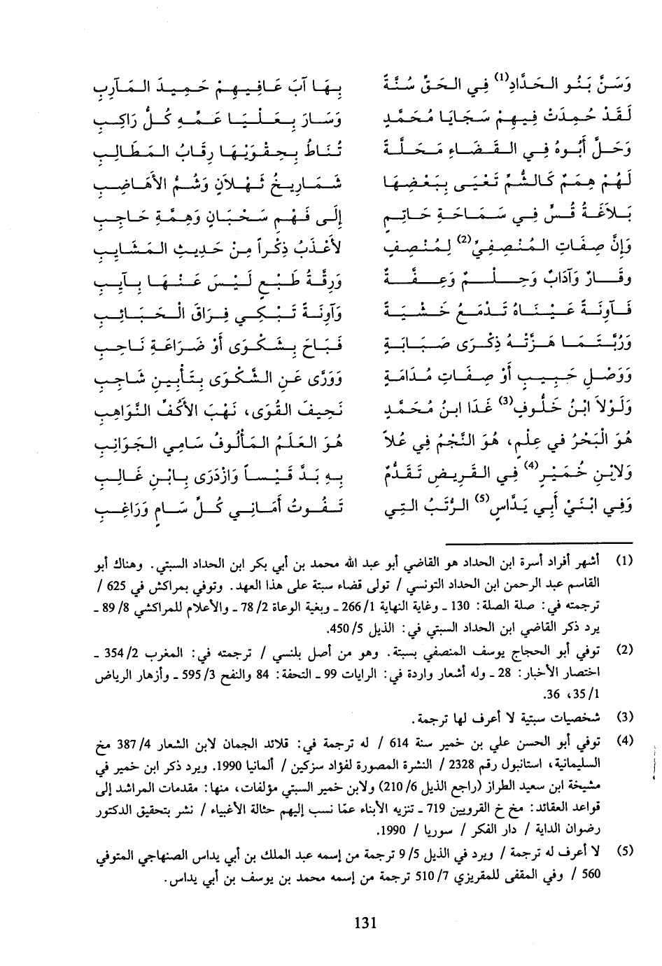 (¬1) أشهر أفراد أسرة ابن الحداد هو القاضي أبو عبد الله محمد بن أبي بكر ابن الحداد السبتي. وهناك أبو القاسم عبد الرحمن ابن الحداد التونسي / تولى قضاء سبتة على هذا العهد. وتوفي بمراكش في / 625 ترجمته في: صلة الصلة: 130 - وغاية النهاية 266/ 1 - وبغية الوعاة 78/ 2 - والأعلام للمراكشي 89/ 8 - يرد ذكر القاضي ابن الحداد السبتي في: الذيل 450/ 5.