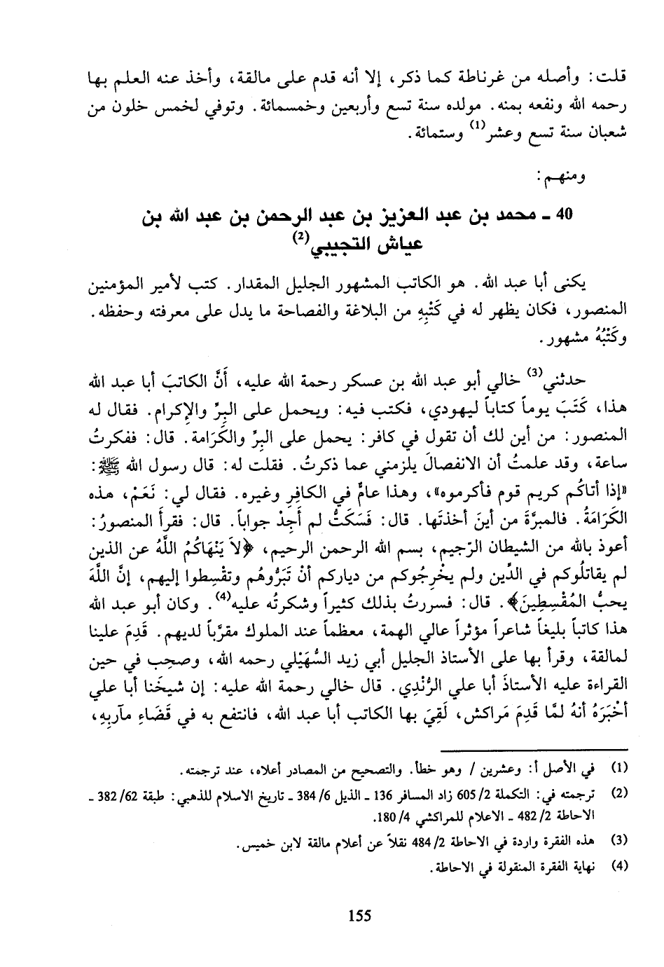 أعوذ بالله من الشيطان الرّجيم، بسم الله الرحمن الرحيم، {لا يَنْهاكُمُ اللهُ عَنِ الَّذِينَ لَمْ يُقاتِلُوكُمْ فِي الدِّينِ وَلَمْ يُخْرِجُوكُمْ مِنْ دِيارِكُمْ أَنْ تَبَرُّوهُمْ وَتُقْسِطُوا إِلَيْهِمْ، إِنَّ اللهَ يُحِبُّ الْمُقْسِطِينَ}.قال: فسررت بذلك كثيرا وشكرته عليه (¬4). وكان أبو عبد الله هذا كاتبا بليغا شاعرا مؤثرا عالي الهمة، معظما عند الملوك مقرّبا لديهم. قدم علينا لمالقة، وقرأ بها على الأستاذ الجليل أبي زيد السّهيلي رحمه الله، وصحب في حين القراءة عليه الأستاذ أبا علي الرّندي. قال خالي رحمة الله عليه: إن شيخنا أبا علي أخبره أنه لمّا قدم مراكش، لقي بها الكاتب أبا عبد الله، فانتفع به في قضاء مآربه،