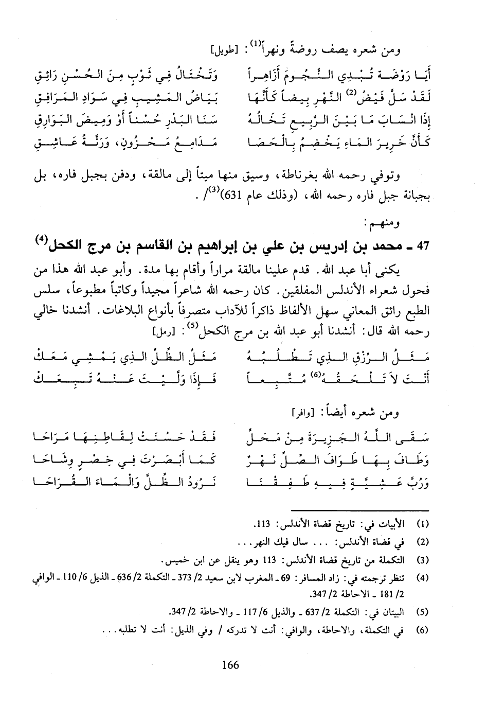 يكنى أبا عبد الله. قدم علينا مالقة مرارا وأقام بها مدة. وأبو عبد الله هذا من فحول شعراء الأندلس المفلقين. كان رحمه الله شاعرا مجيدا وكاتبا مطبوعا، سلس الطبع رائق المعاني سهل الألفاظ ذاكرا للآداب متصرفا بأنواع البلاغات. أنشدنا خالي رحمه الله قال: أنشدنا أبو عبد الله بن مرج الكحل (¬5): [رمل]
