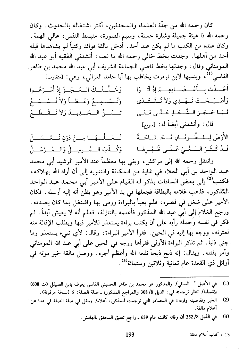 ورجع الغلام إلى أبي عبد الله المذكور فأعلمه بالنازلة، فعلم أنه لا يعيش أبدا. ثم فكر في نفسه وحمله رأيه على أن يكتب براءة يستعذر للأمير فيها ويطلب الإقالة منه لعثرته، ووجه بها إليه في الحين. فقرأ الأمير البراءة، وقال: لأي شيء يستعذر وما جنى ذنبا. ثم تذكر البراءة الأولى فقرأها ووجه في الحين على أبي عبد الله المومناني وأمر بقتله. ويقال: إنه ذبح ذبحا نفعه الله وأعظم أجره. ووصل مالقة خبر موته في أوائل ذي القعدة عام ثمانية وثلاثين وستمائة (¬3).
