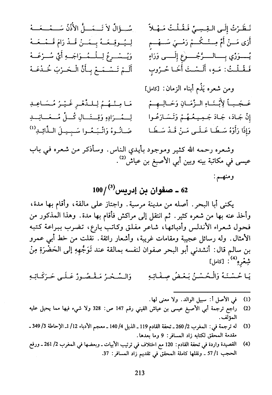يكنى أبا البحر. أصله من مدينة مرسية. واجتاز على مالقة، وأقام بها مدة، وأخذ عنه بها من شعره كثير. ثم انتقل إلى مراكش فأقام بها مدة. وهذا المذكور من فحول شعراء الأندلس وأدبائها، شاعر مفلق وكاتب بارع، تضرب ببراعة كتبه الأمثال. وله رسائل عجيبة ومقامات غريبة، وأشعار رائقة. نقلت من خط أبي عمرو بن سالم قال: أنشدني أبو البحر صفوان لنفسه بمالقة عند توجّهه إلى الحضرة من شعره (¬4): [كامل]