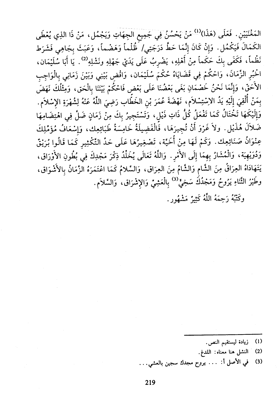 وإليكها تختال كما تفعل كلّ ذات ذيل، وتستجير بك من زمان ضلّ في اهتضامها ضلال هذيل. ولا غرو أن تجيرها، فالفضيلة خامسة طبائعك، وإسعاف مؤمّلك عنوان صنائعك. وكم لها من أخيّة، تصغيرها على حدّ التّكثير كما قالوا بريق ودويهية، والمشار بهما إلى الأمر. والله تعالى يخلّد ذكر مجدك في بطون الأوراق، يتهاداه العراق من الشّام والشّام من العراق، والسّلام كما اعتمره الزّمان بالأشواق، وطير الثّناء يروح ومجدك سخيّ (¬3) بالعشيّ والإشراق، والسّلام.