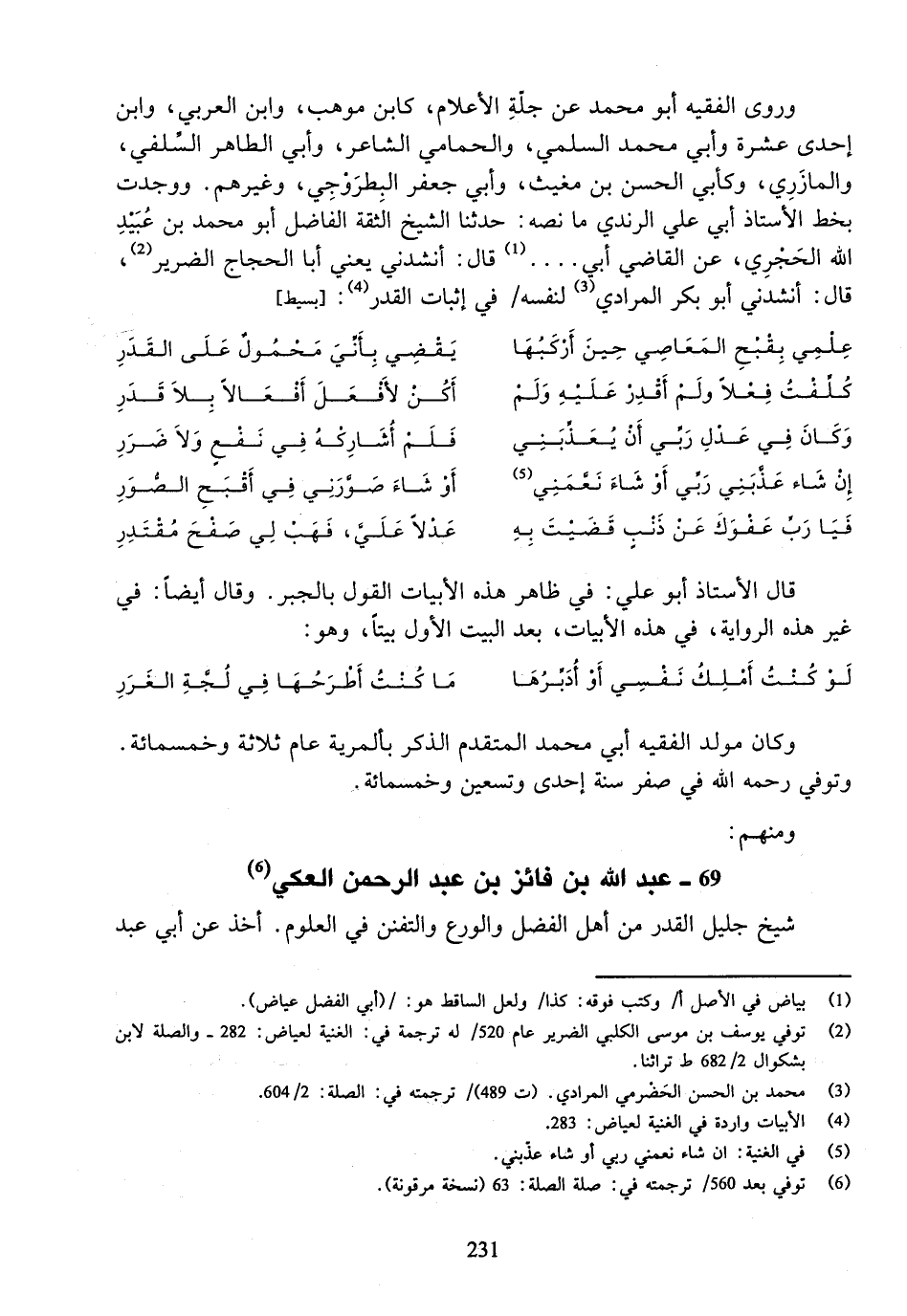 وروى الفقيه أبو محمد عن جلّة الأعلام، كابن موهب، وابن العربي، وابن إحدى عشرة وأبي محمد السلمي، والحمامي الشاعر، وأبي الطاهر السّلفي، والمازري، وكأبي الحسن بن مغيث، وأبي جعفر البطروجي، وغيرهم. ووجدت بخط الأستاذ أبي علي الرندي ما نصه: حدثنا الشيخ الثقة الفاضل أبو محمد بن عبيد الله الحجري، عن القاضي أبي .... (¬1) قال: أنشدني يعني أبا الحجاج الضرير (¬2)، قال: أنشدني أبو بكر المرادي (¬3) لنفسه / في إثبات القدر (¬4): [بسيط]
