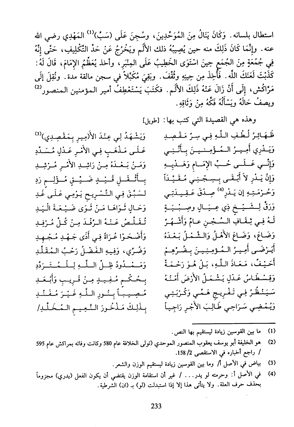 كذبت لعنك الله. فأخذ من حينه وثقّف. وبقي مكبّلا في سجن مالقة مدة. ونقل إلى مرّاكش، إلى أن زال عنه ذلك الألم. فكتب يستعطف أمير المؤمنين المنصور (¬2) ويصف حاله ويسأله فكّه من وثاقه.