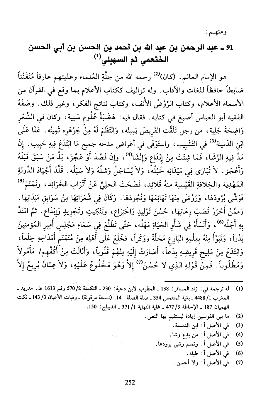 هو الإمام العالم. (كان) (¬2) رحمه الله من جلّة العلماء وعليتهم عارفا متفنّنا ضابطا حافظا للغات والآداب. وله تواليف ككتاب الأعلام بما وقع في القرآن من الأسماء الأعلام، وكتاب الرّوض الأنف، وكتاب نتائج الفكر، وغير ذلك. وصفه الفقيه أبو العباس أصبغ في كتابه. فقال فيه: هضبة علوم سنية، وكان في الشّعر واضحة جلية، من رجل تلقّت القريض يمينه، وانتظم له من جوهره ثمينه. عفا على ابن الدّمينة (¬3) في التّشبيب، واستوفى في أغراض مدحه جميع ما ابتدع فيه حبيب. إن مدّ فيه الرّشا، فما شئت من إبداع وإنشاء (¬4)، وإن قصّد أو عجّز، بذّ من سبق قبله وأعجز. لا تبارى في ميدانه خيله، ولا يساجل وشله ولا سيله. قلّد أجياد الدّولة المهدية والخلافة القيسية منه قلائد، فضحت الحليّ عن أتراب الخرائد، ونمنم (¬5) فوشّى برودها، وروّض منها تهائمها ونجودها. وكان في شعرائها من سوابق ميدانها.