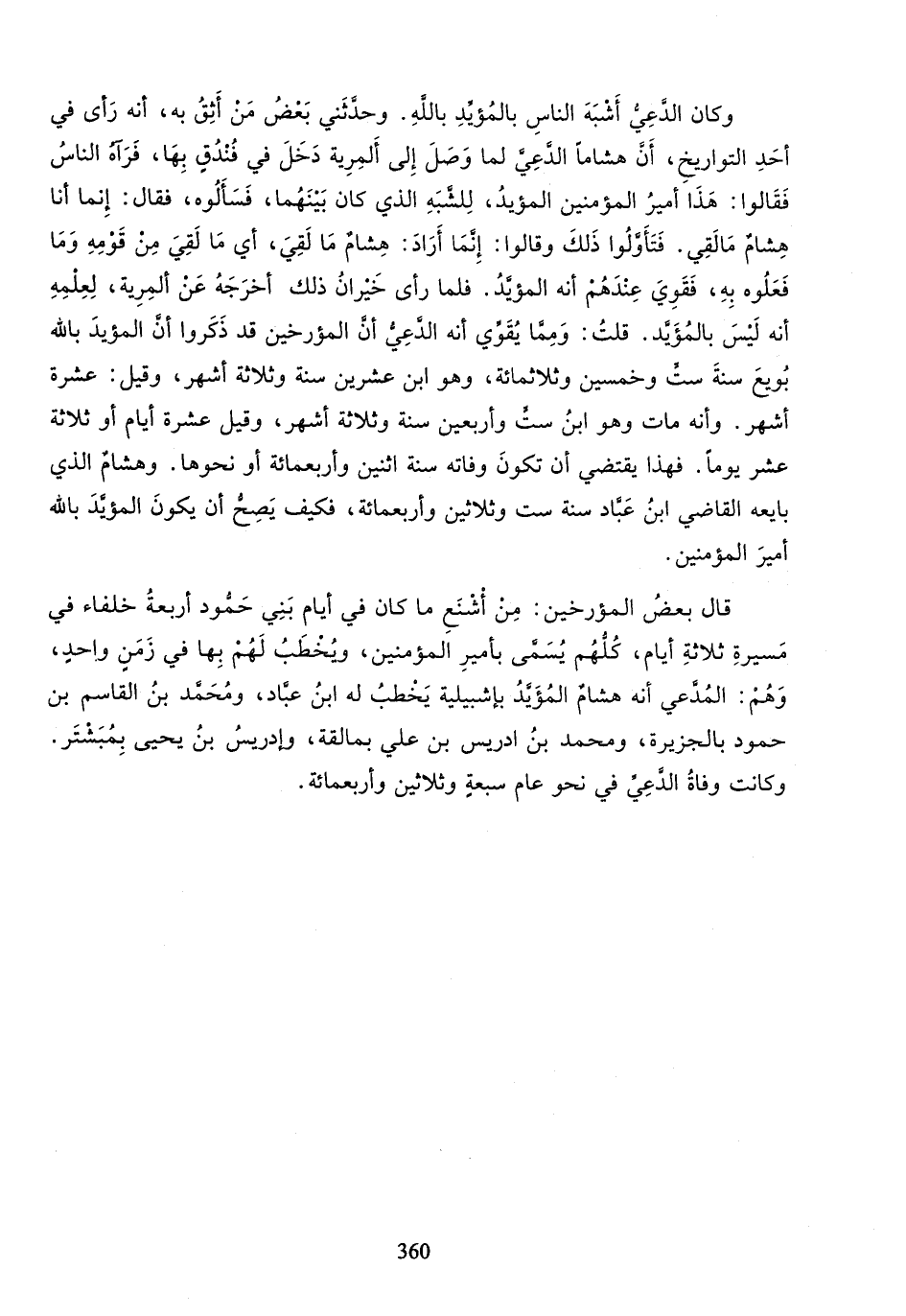 وكان الدّعيّ أشبه الناس بالمؤيّد بالله. وحدّثني بعض من أثق به، أنه رأى في أحد التواريخ، أنّ هشاما الدّعيّ لما وصل إلى المرية دخل في فندق بها، فرآه الناس فقالوا: هذا أمير المؤمنين المؤيد، للشّبه الذي كان بينهما، فسألوه، فقال: إنما أنا هشام مالقي. فتأوّلوا ذلك وقالوا: إنّما أراد: هشام ما لقي، أي ما لقي من قومه وما فعلوه به، فقوي عندهم أنه المؤيّد. فلما رأى خيران ذلك أخرجه عن المرية، لعلمه أنه ليس بالمؤيّد. قلت: وممّا يقوّي أنه الدّعيّ أنّ المؤرخين قد ذكروا أنّ المؤيد بالله بويع سنة ستّ وخمسين وثلاثمائة، وهو ابن عشرين سنة وثلاثة أشهر، وقيل: عشرة أشهر. وأنه مات وهو ابن ستّ وأربعين سنة وثلاثة أشهر، وقيل عشرة أيام أو ثلاثة عشر يوما. فهذا يقتضي أن تكون وفاته سنة اثنين وأربعمائة أو نحوها. وهشام الذي بايعه القاضي ابن عبّاد سنة ست وثلاثين وأربعمائة، فكيف يصحّ أن يكون المؤيّد بالله أمير المؤمنين.