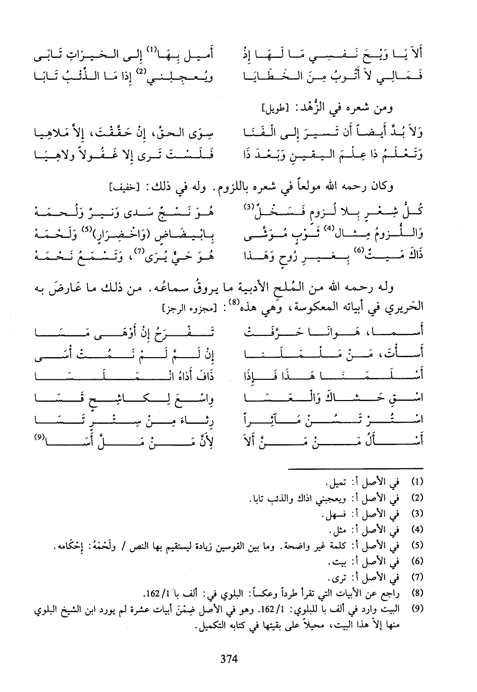 (¬9) البيت وارد في ألف با للبلوي: 162/ 1.وهو في الأصل ضمن أبيات عشرة لم يورد ابن الشيخ البلوي منها إلاّ هذا البيت، محيلا على بقيتها في كتابه التكميل.