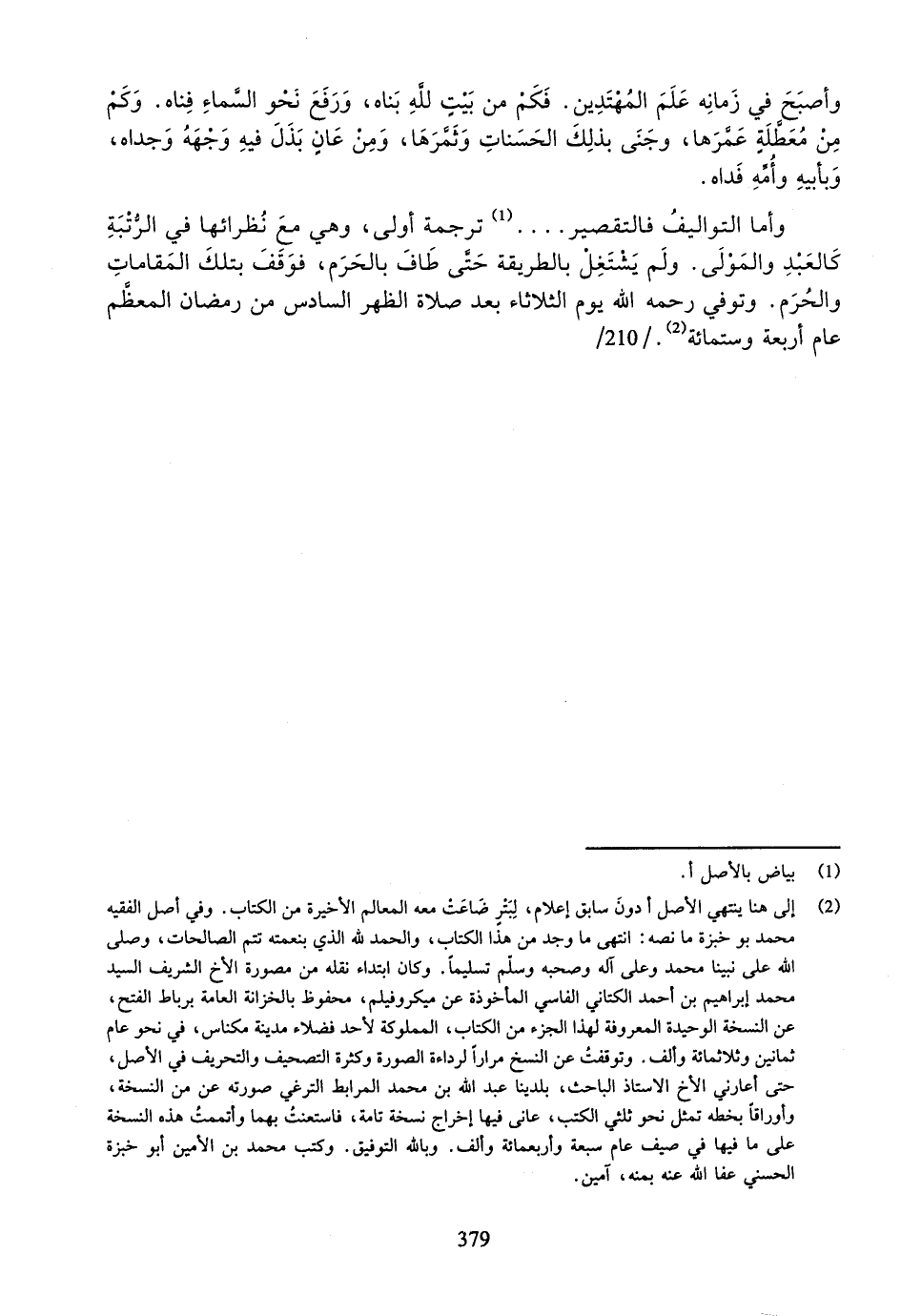 (¬2) إلى هنا ينتهي الأصل أدون سابق إعلام، لبتر ضاعت معه المعالم الأخيرة من الكتاب. وفي أصل الفقيه محمد بو خبزة ما نصه: انتهى ما وجد من هذا الكتاب، والحمد لله الذي بنعمته تتم الصالحات، وصلّى الله على نبينا محمد وعلى آله وصحبه وسلّم تسليما. وكان ابتداء نقله من مصورة الأخ الشريف السيد محمد إبراهيم بن أحمد الكتاني الفاسي المأخوذة عن ميكروفيلم، محفوظ بالخزانة العامة برباط الفتح، عن النسخة الوحيدة المعروفة لهذا الجزء من الكتاب، المملوكة لأحد فضلاء مدينة مكناس، في نحو عام ثمانين وثلاثمائة وألف. وتوقفت عن النسخ مرارا لرداءة الصورة وكثرة التصحيف والتحريف في الأصل، حتى أعارني الأخ الاستاذ الباحث، بلدينا عبد الله بن محمد المرابط الترغي صورته عن من النسخة، وأوراقا بخطه تمثل نحو ثلثي الكتب، عانى فيها إخراج نسخة تامة، فاستعنت بهما وأتممت هذه النسخة على ما فيها في صيف عام سبعة وأربعمائة وألف. وبالله التوفيق. وكتب محمد بن الأمين أبو خبزة الحسني عفا الله عنه بمنه، آمين.