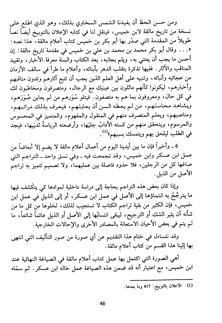 ومن حسن الحظ أن يفيدنا الشمس السخاوي بذلك، وهو الذي اطلع على نسخة من تاريخ مالقة لابن خميس، فينقل لنا في كتابه الإعلان بالتوبيخ أيضا نصا طويلا من المقدمة التي صدّر بها أبو بكر بن خميس كتاب أعلام مالقة، هذا نصه: