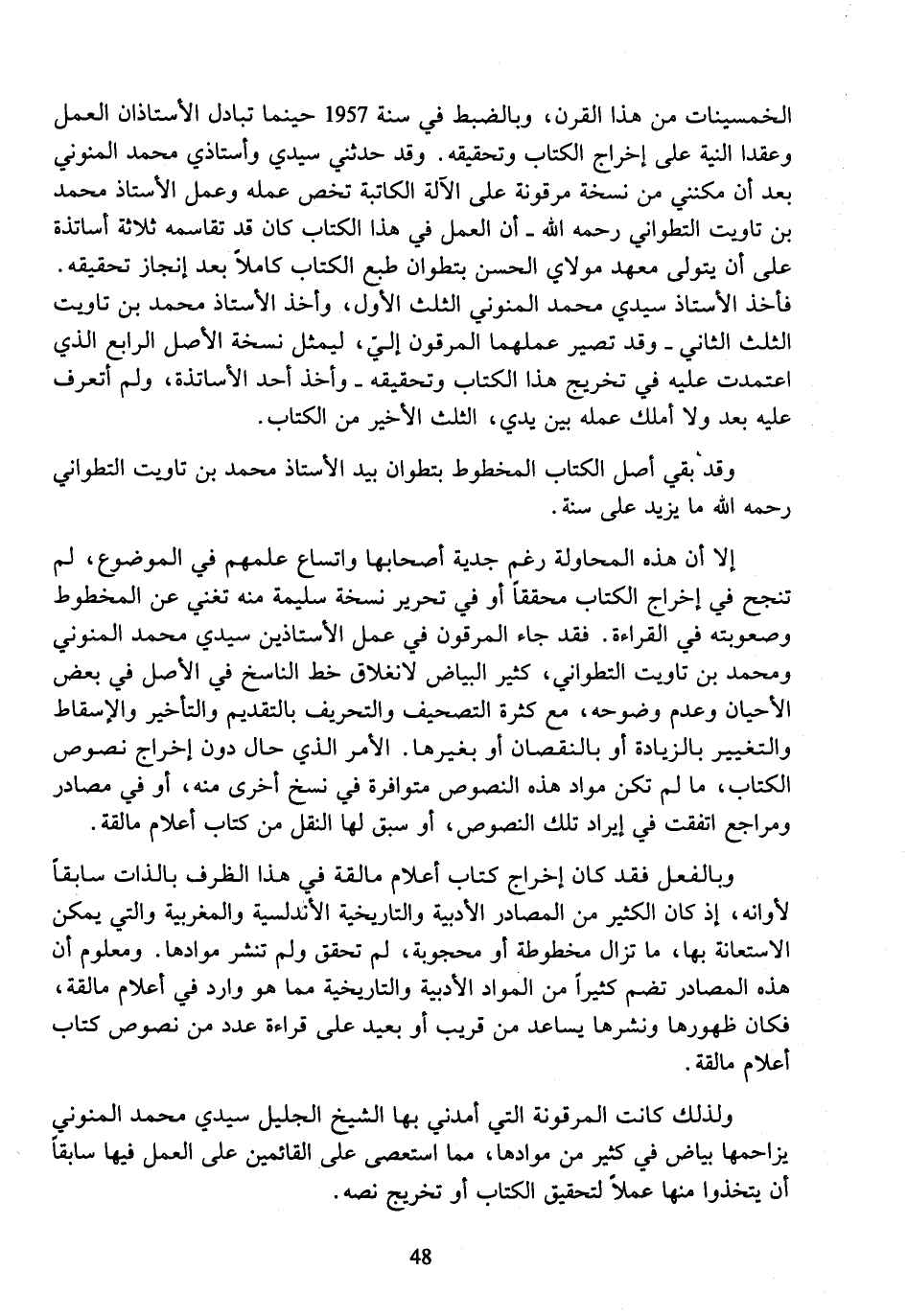 الخمسينات من هذا القرن، وبالضبط في سنة 1957 حينما تبادل الأستاذان العمل وعقدا النية على إخراج الكتاب وتحقيقه. وقد حدثني سيدي وأستاذي محمد المنوني بعد أن مكنني من نسخة مرقونة على الآلة الكاتبة تخص عمله وعمل الأستاذ محمد بن تاويت التطواني رحمه الله - أن العمل في هذا الكتاب كان قد تقاسمه ثلاثة أساتذة على أن يتولى معهد مولاي الحسن بتطوان طبع الكتاب كاملا بعد إنجاز تحقيقه.
