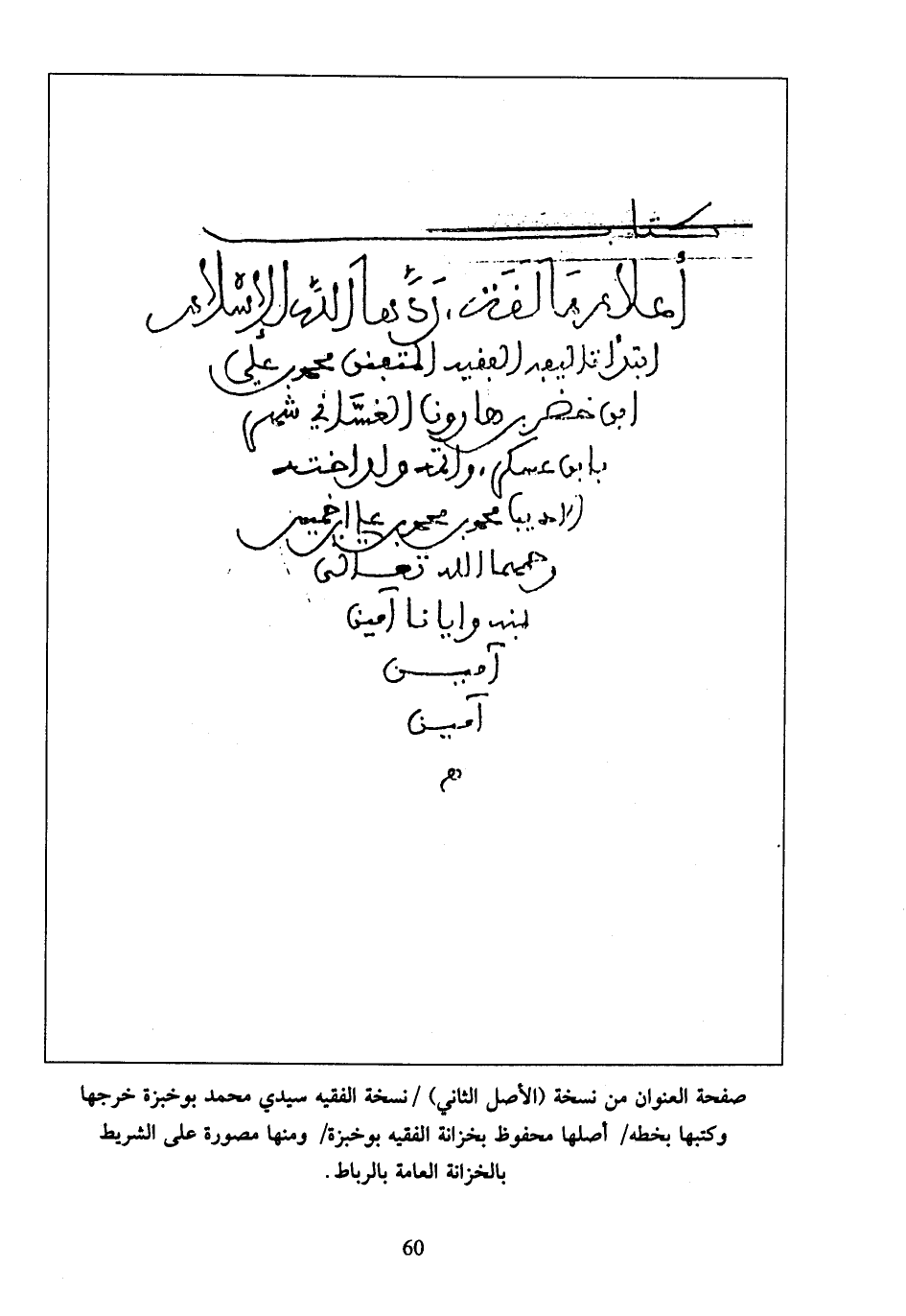 صفحة العنوان من نسخة (الأصل الثاني) / نسخة الفقيه سيدي محمد بوخبزة خرجها وكتبها بخطه / أصلها محفوظ بخزانة الفقيه بوخبزة / ومنها مصورة على الشريط بالخزانة العامة بالرباط.