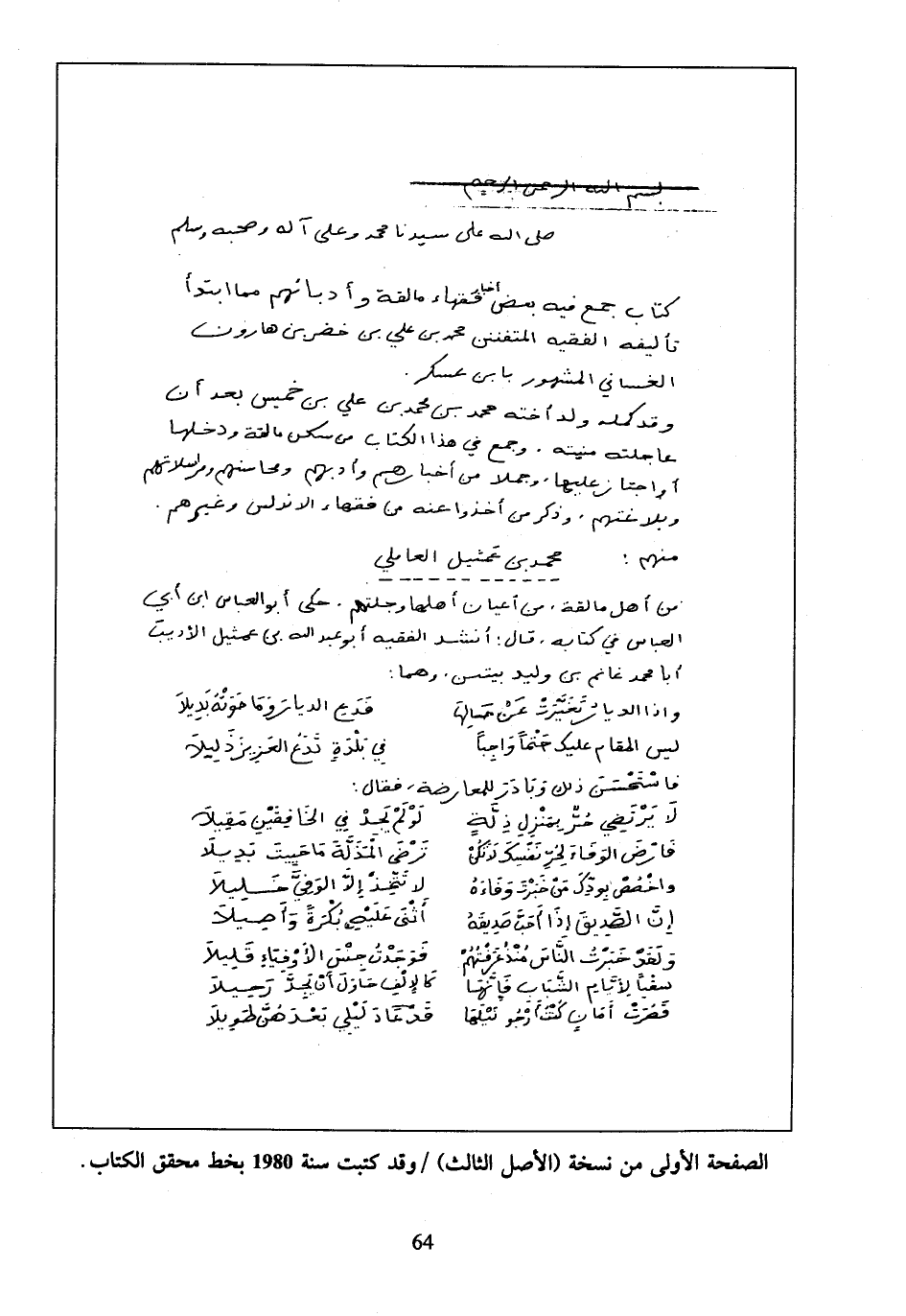 الصفحة الأولى من نسخة (الأصل الثالث) / وقد كتبت سنة 1980 بخط محقق الكتاب.