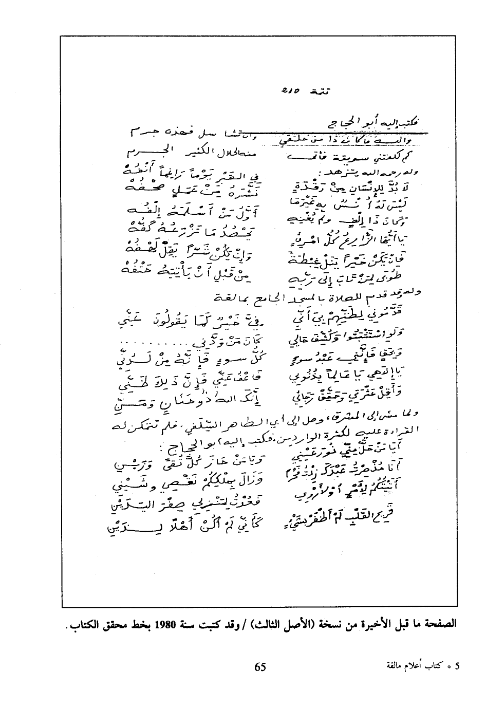 الصفحة ما قبل الأخيرة من نسخة (الأصل الثالث) / وقد كتبت سنة 1980 بخط محقق الكتاب.