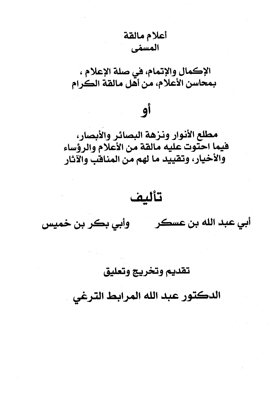 أعلام مالقة المسمّى الإكمال والإتمام، في صلة الإعلام، بمحاسن الأعلام، من أهل مالقة الكرام أو مطلع الأنوار ونزهة البصائر والأبصار، فيما احتوت عليه مالقة من الأعلام والرؤساء والأخيار، وتقييد ما لهم من المناقب والآثار تأليف أبي عبد الله بن عسكر وأبي بكر بن خميس تقديم وتخريج وتعليق الدكتور عبد الله المرابط الترغي