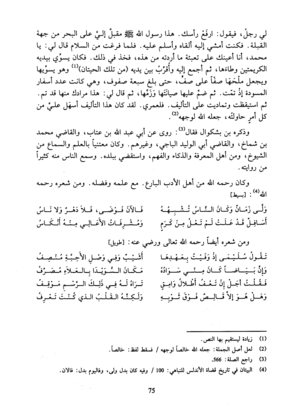 لي رجل، فيقول: ارفع رأسك. هذا رسول الله صلّى الله عليه وسلم مقبل إليّ على البحر من جهة القبلة. فكنت أمشي إليه ألقاه وأسلم عليه. فلما فرغت من السلام قال لي: يا محمد، أنا أعينك على تعبئة ما أردته من هذه، فخذ في ذلك. فكان يسوّي بيديه الكريمتين وطاءها، ثم أجمع إليه وأقرب بين يديه (من تلك الحيتان) (¬1) وهو يسوّيها ويجعل ملحها صفّا على صفّ، حتى بلغ سبعة صفوف، وهي كانت عدد أسفار المسودة إذ تمّت. ثم ضمّ عليها صيانتها وزمّها، ثم قال لي: هذا مرادك منها قد تم.