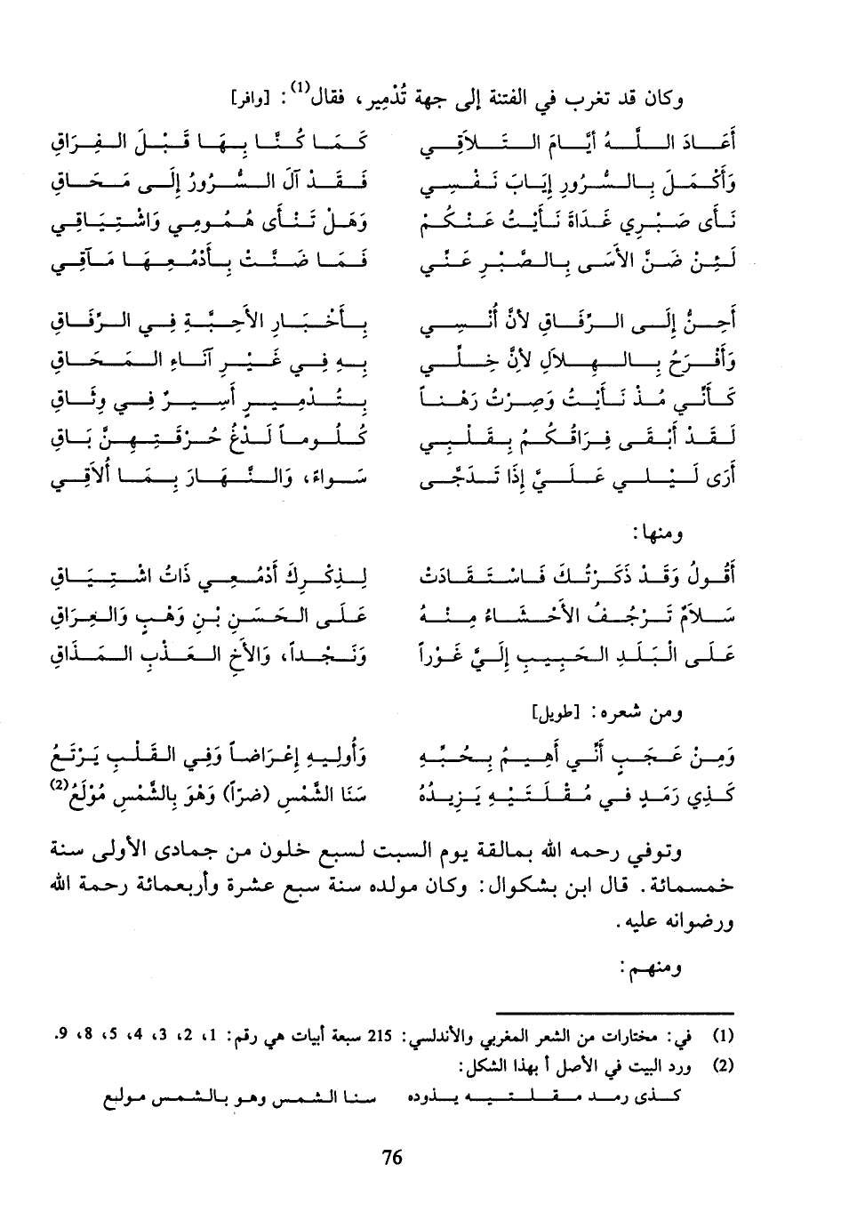 (¬1) في: مختارات من الشعر المغربي والأندلسي: 215 سبعة أبيات هي رقم: 1، 2، 3، 4، 5، 8، 9.