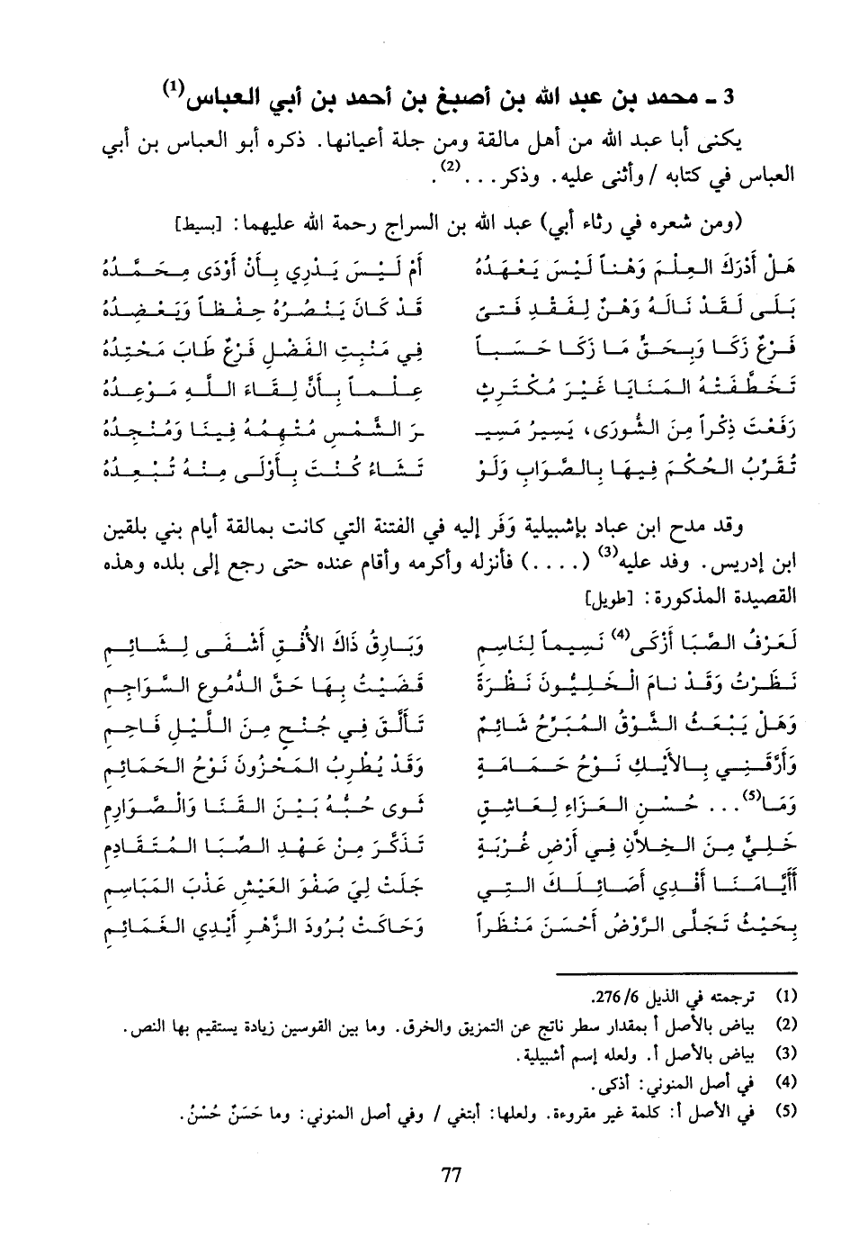وقد مدح ابن عباد بإشبيلية وفر إليه في الفتنة التي كانت بمالقة أيام بني بلقين ابن إدريس. وفد عليه (¬3) (....) فأنزله وأكرمه وأقام عنده حتى رجع إلى بلده وهذه القصيدة المذكورة: [طويل]