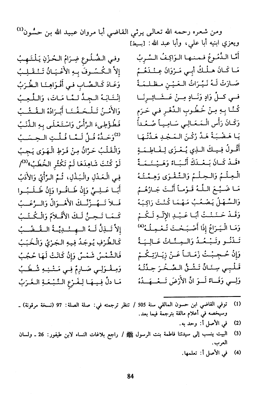 ومن شعره رحمه الله تعالى يرثي القاضي أبا مروان عبيد الله بن حسّون (¬1) ويعزي ابنيه أبا علي، وأبا عبد الله: [بسيط]