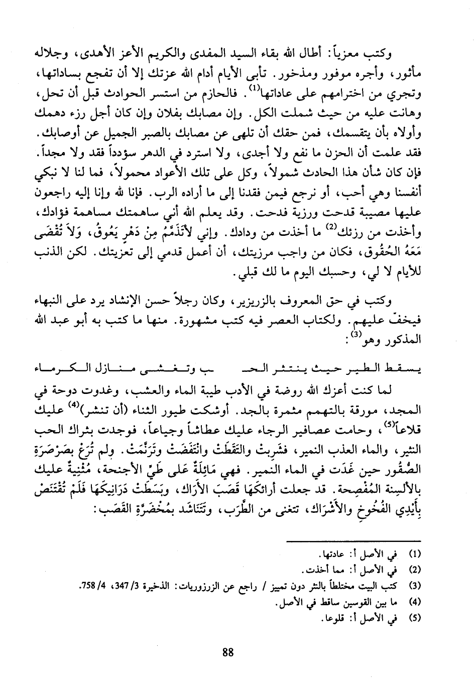 فإن كان شأن هذا الحادث شمولا، وكل على تلك الأعواد محمولا، فما لنا لا نبكي أنفسنا وهي أحب، أو نرجع فيمن فقدنا إلى ما أراده الرب. فإنا لله وإنا إليه راجعون عليها مصيبة قدحت ورزية فدحت. وقد يعلم الله أني ساهمتك مساهمة فؤادك، وأخذت من رزئك (¬2) ما أخذت من ودادك. وإني لأتذمّم من دهر يعوق، ولا تقضى معه الحقوق، فكان من واجب مرزيتك، أن أعمل قدمي إلى تعزيتك. لكن الذنب للأيام لا لي، وحسبك اليوم ما لك قبلي.