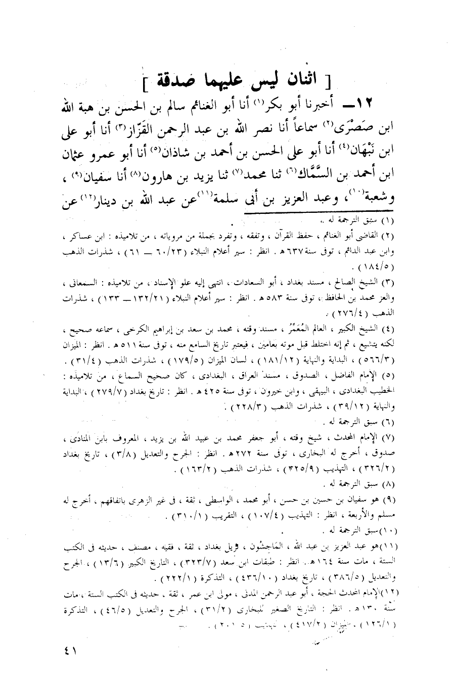 12 - أَخْبَرَنَا أَبُو بَكْرٍ أَنَا أَبُو الْغَنَائِمِ سَالِمُ بْنُ الْحَسَنِ بْنِ هبة الله إِبْنِ صَصْرَى سَمَاعًا أَنَا نَصْرُ اللَّهِ بْنُ عَبْدِ الرَّحْمَنِ الْقَزَّازُ أَنَا أَبُو على إِبْنِ نَبْهَانَ أَنَا أَبُو عَلِيٍّ الْحَسَنُ بْنُ أَحْمَدَ بْنِ شَاذَانَ أَنَا أَبُو عَمْرو عُثْمَان إِبْنِ أَحْمَدَ بْنِ السَّمَّاكِ ثَنَا مُحَمَّدٌ يَزِيدُ بْنُ هَارُونَ أَنَا سُفْيَانُ وَشعْبَة وَعبد الْعَزِيزِ بْنُ أَبِي سَلَمَةَ عَنْ عَبْدِ اللَّهِ بْنِ دِينَارٍ عَنْ