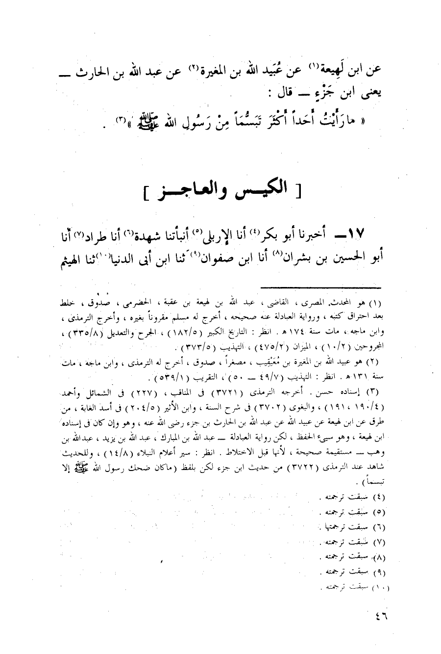 17 - أَخْبَرَنَا أَبُو بَكْرٍ أَنَا الْإِرْبِلِيُّ أَنْبَأَتْنَا شُهْدَةُ أَنَا طِرَادٌ أَنَا أَبُو الْحُسَيْنِ بْنُ بِشْرَانَ أَنَا ابْنُ صَفْوَانَ ثَنَا ابْنُ أَبِي الدُّنْيَا ثَنَا الْهَيْثَم إِبْنِ خَارِجَةَ ثَنَا بَقِيَّةُ بْنُ الْوَلِيدِ عَنْ أَبِي بَكْرِ بْنِ عَبْدِ اللَّهِ بْنِ أَبِي مَرْيَمَ حَدَّثَنِي ضَمْرَةُ بْنُ حَبِيبٍ عَنْ أَبِي يَعْلَى شَدَّادِ بْنِ أَوْسٍ قَالَ قَالَ رَسُول الله صلى اله عَلَيْهِ وَسَلَّمَ