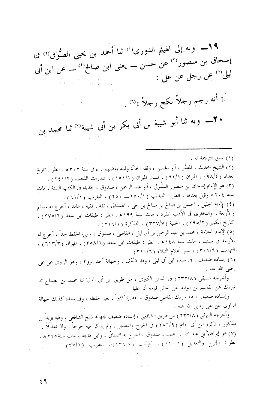 19 - وَبِهِ إِلَى الْهَيْثَمِ الدُّورِيِّ ثَنَا أَحْمَدُ بْنُ يَحْيَى الصُّوفِيُّ ثَنَا إِسْحَاقُ بْنُ مَنْصُورٍ عَنْ حَسَنٍ يَعْنِي ابْنَ صَالِحٍ عَنِ ابْنِ أَبِي لَيْلَى عَنْ رَجُلٍ عَنْ عَلِيٍّ