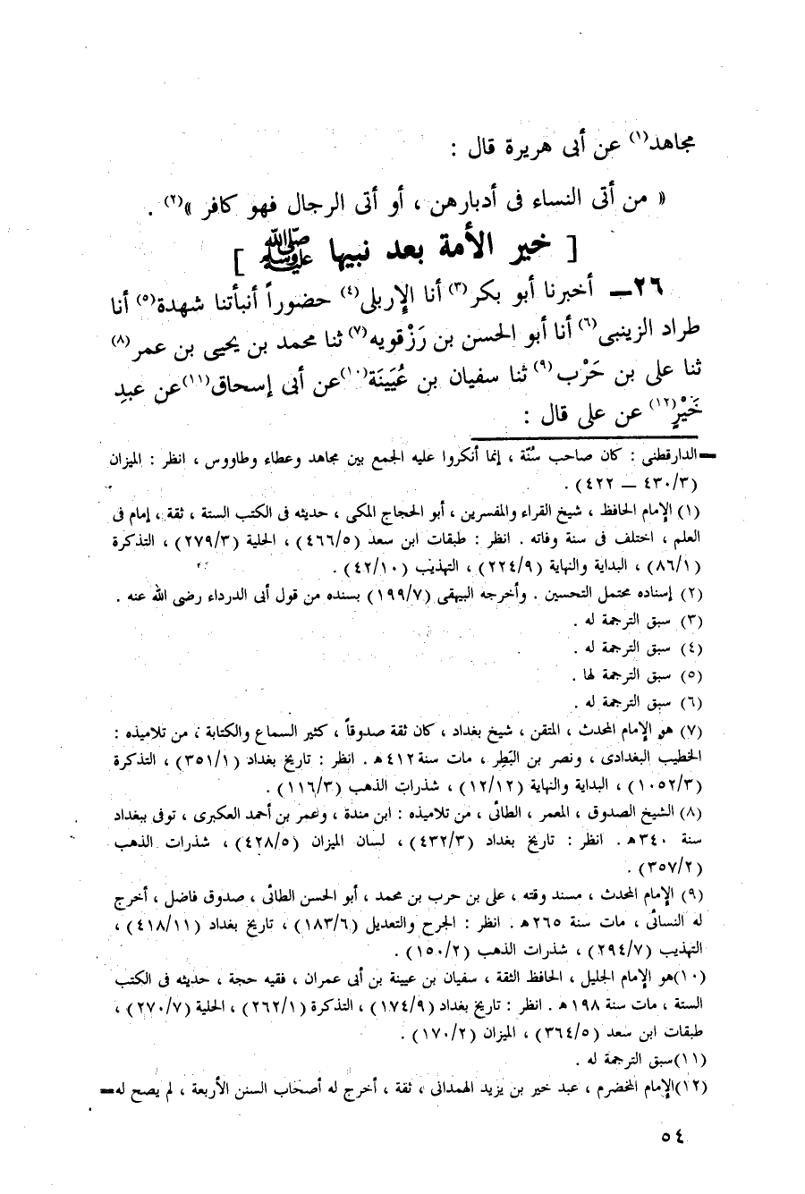 26 - أَخْبَرَنَا أَبُو بَكْرٍ أَنَا الْإِرْبِلِيُّ حُضُورًا أَنْبَأَتْنَا شُهْدَةُ أَنَا طِرَادٌ الزَّيْنَبِيُّ أَنَا أَبُو الْحَسَنِ بْنُ رِزْقَوَيْهِ ثَنَا مُحَمَّدُ بْنُ يَحْيَى بْنِ عُمَرَ ثَنَا عَلِيُّ بْنُ حَرْبٍ ثَنَا سُفْيَانُ بْنُ عُيَيْنَةَ عَنْ أَبِي إِسْحَاقَ عَنْ عَبْدِ خَيْرٍ عَنْ عَلِيٍّ قَالَ