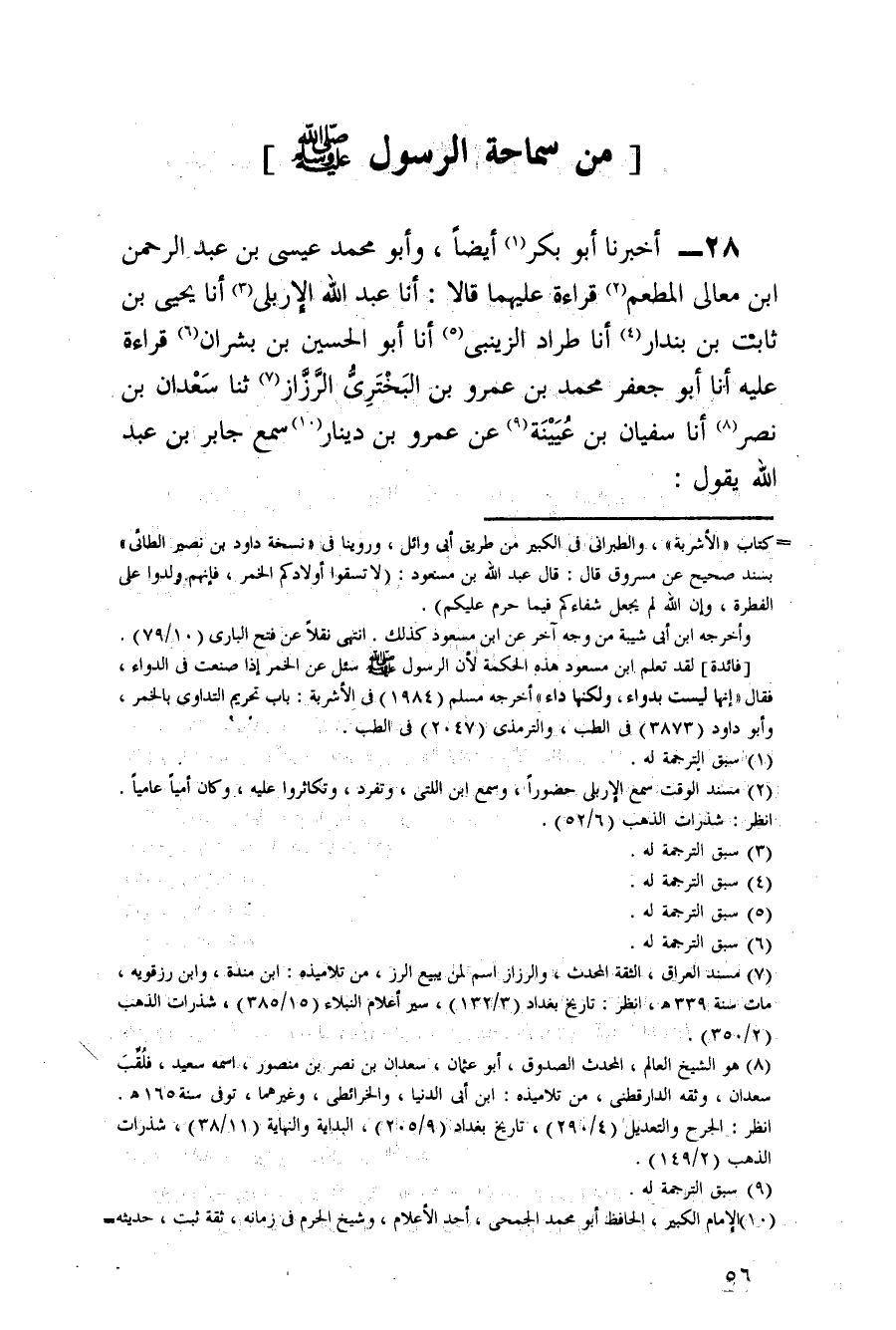 28 - أخبرنَا أَبُو بكر أَيْضا وَأَبُو مُحَمَّدٍ عِيسَى بْنُ عَبْدِ الرَّحْمَنِ ابْن معالى الْمطعم قِرَاءَةً عَلَيْهِمَا قَالَا أَنَا عَبْدُ اللَّهِ الْإِرْبِلِيُّ أَنَا يَحْيَى بْنُ ثَابِتِ بْنِ بُنْدَارٍ أَنَا طِرَادٌ الزَّيْنَبِيُّ أَنَا أَبُو الْحُسَيْنِ بْنُ بِشْرَانَ قِرَاءَةً عَلَيْهِ أَنَا أَبُو جَعْفَرٍ مُحَمَّدُ بْنُ عَمْرِو بْنِ الْبَخْتَرِيِّ الرَّزَّازُ ثَنَا سَعْدَانُ بْنُ نَصْرٍ أَنَا سُفْيَانُ بْنُ عُيَيْنَةَ عَنْ عَمْرِو بْنِ دِينَارٍ سَمِعَ جَابِرَ بْنَ عَبْدِ اللَّهِ يَقُولُ