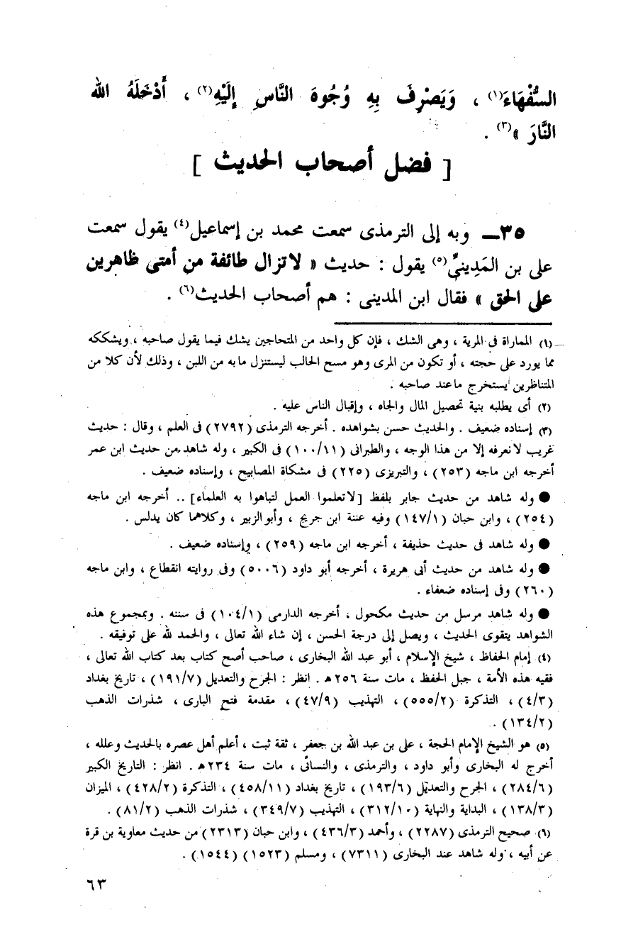 35 - وَبِهِ إِلَى التِّرْمِذِيِّ سَمِعْتُ مُحَمَّدَ بْنَ إِسْمَاعِيلَ يَقُولُ سَمِعْتُ عَلِيَّ بْنَ الْمَدِينِيِّ يَقُولُ حَدِيثَ لَا تَزَالُ طَائِفَةٌ مِنْ أُمَّتِي ظَاهِرِينَ عَلَى الْحَقِّ فَقَالَ ابْنُ الْمَدِينِيِّ هم أَصْحَاب الحَدِيث