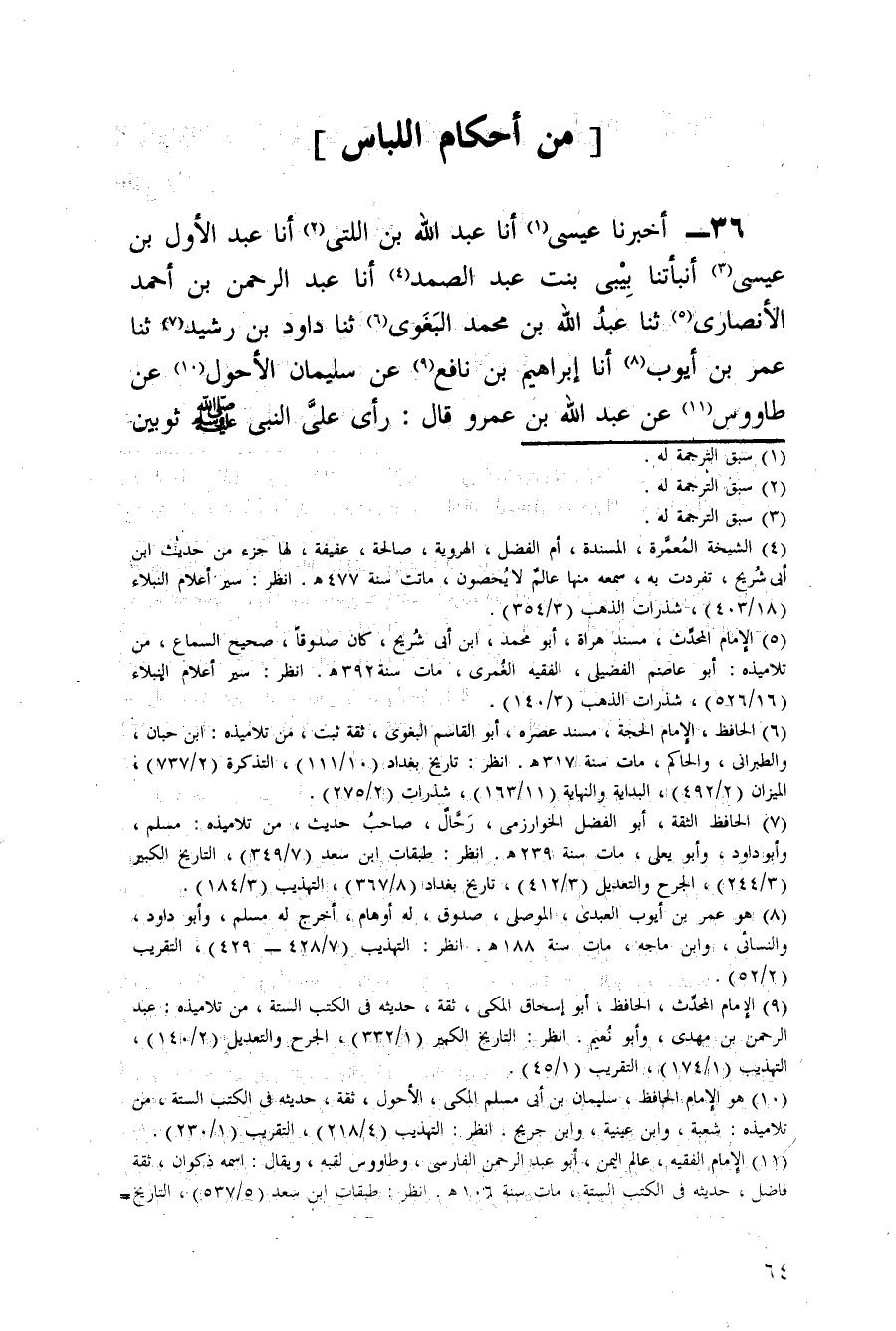 36 - أَخْبَرَنَا عِيسَى أَنَا عَبْدُ اللَّهِ بْنُ اللَّتِّيِّ أَنَا عَبْدُ الْأَوَّلِ بْنُ عِيسَى أَنْبَأَتْنَا بَيْبِي بِنْتُ عَبْدِ الصَّمَدِ أَنَا عَبْدُ الرَّحْمَنِ بْنُ أَحْمَدَ الْأَنْصَارِيُّ ثَنَا عَبْدُ اللَّهِ بْنُ مُحَمَّدٍ الْبَغَوِيُّ ثَنَا دَاوُدُ بْنُ رُشَيْدٍ ثَنَا عُمَرُ بْنُ أَيُّوبَ أَنَا إِبْرَاهِيمُ بْنُ نَافِعٍ عَنْ سُلَيْمَانَ الْأَحْوَلِ عَنْ طَاوُوس عَنْ عَبْدِ اللَّهِ بْنِ عَمْرٍو قَالَ رَأَى عَلَيَّ النَّبِيُّ صَلَّى اللَّهُ عَلَيْهِ وَسَلَّمَ ثَوْبَيْنِ مُعَصْفَرَيْنِ فَقَالَ أأمك أَمَرَتْكَ بِهَذَا