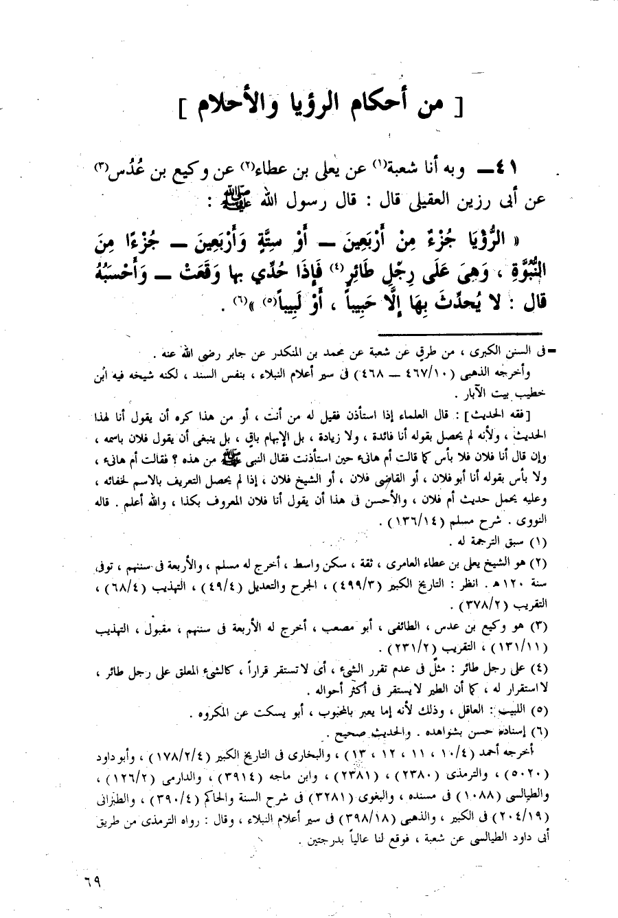 الرُّؤْيَا جُزْءٌ مِنْ أَرْبَعِينَ أَوْ سِتَّةٍ وَأَرْبَعِينَ جُزْءًا مِنَ النُّبُوَّةِ وَهِيَ عَلَى رِجْلِ طَائِرٍ فَإِذَا حُدِّيَ بِهَا وَقَعَتْ وَأَحْسَبُهُ قَالَ لَا يُحَدِّثُ بِهَا إِلَّا حَبِيبًا أَوْ لَبِيبًا
