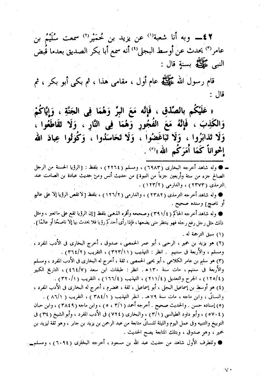 عَلَيْكُمْ بِالصِّدْقِ فَإِنَّهُ مَعَ الْبِرِّ وَهُمَا فِي الْجَنَّةِ وَإِيَّاكُمْ وَالْكَذِبَ فَإِنَّهُ مَعَ الْفُجُورِ وَهُمَا فِي النَّارِ وَلَا تَقَاطَعُوا وَلَا تَدَابَرُوا وَلَا تَبَاغَضُوا وَلَا تَحَاسَدُوا وَكُونُوا عِبَادَ اللَّهِ إِخْوَانًا كَمَا أَمركُم الله