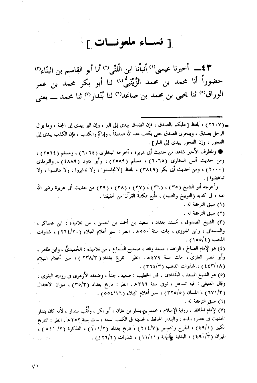 43 - أَخْبَرَنَا عِيسَى أَنْبَأَنَا ابْنُ اللَّتِّيِّ أَنَا أَبُو الْقَاسِمِ بْنُ الْبَنَّاءِ حُضُورًا أَنَا مُحَمَّدُ بْنُ مُحَمَّدٍ الزَّيْنَبِيُّ ثَنَا أَبُو بَكْرٍ مُحَمَّدُ بْنُ عُمَرَ الْوَرَّاقُ ثَنَا يَحْيَى بْنُ مُحَمَّدِ بْنِ صَاعِدٍ ثَنَا بنْدَار ثَنَا مُحَمَّد يعْنى