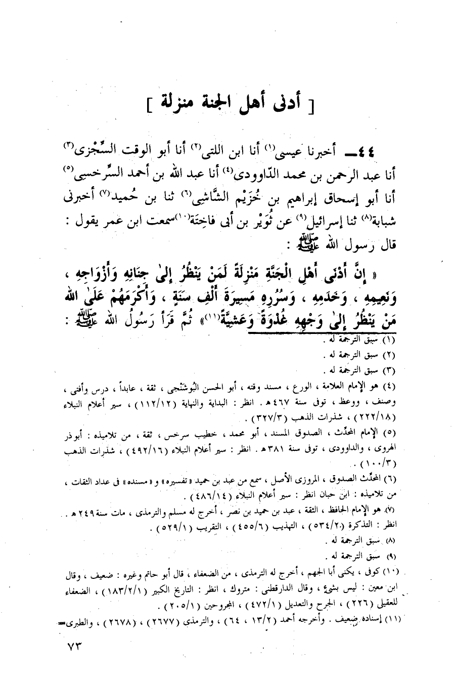إِنَّ أَدْنَى أَهْلِ الْجَنَّةِ منزلَة لمن ينظر الى جناته وَأَزْوَاجِهِ وَنَعِيمِهِ وَخَدَمِهِ وَسُرُرِهِ مَسِيرَةَ أَلْفِ سَنَةٍ وَأَكْرَمُهُمْ عَلَى اللَّهِ مَنْ يَنْظُرُ إِلَى وَجْهِهِ غُدْوَةً وَعَشِيَّةً ثُمَّ قَرَأَ رَسُولُ اللَّهِ صَلَّى اللَّهُ عَلَيْهِ وَسَلَّمَ {وُجُوهٌ يَوْمَئِذٍ نَاضِرَةٌ إِلَى رَبِّهَا نَاظِرَةٌ}
