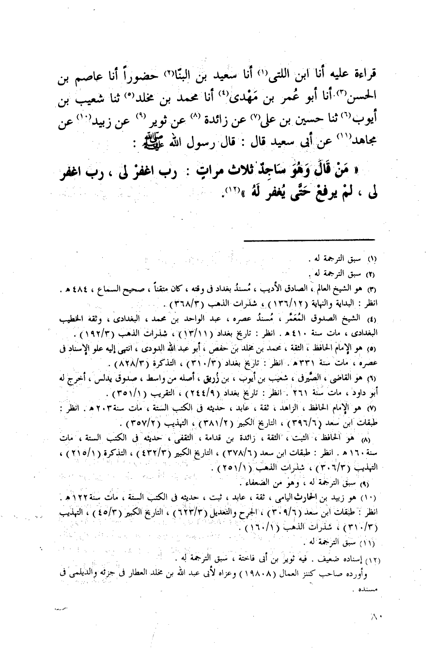 مَنْ قَالَ وَهُوَ سَاجِدٌ ثَلَاثَ مَرَّاتٍ رَبِّ اغْفِرْ لِي رَبِّ اغْفِرْ لِي لَمْ يرفع حَتَّى يغْفر لَهُ