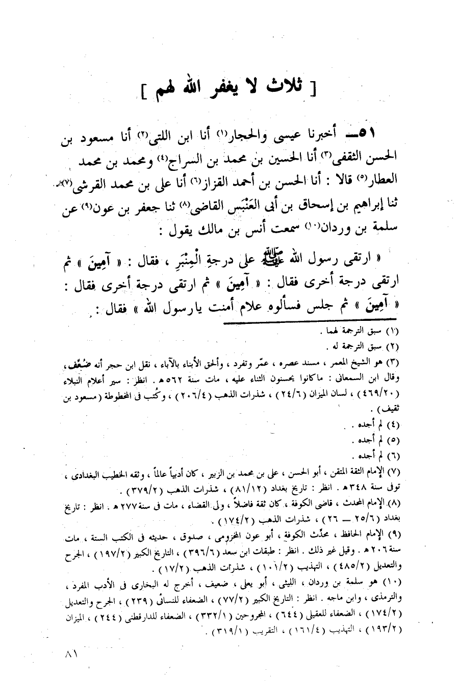 51 - أَخْبَرَنَا عِيسَى وَالْحَجَّارُ أَنَا ابْنُ اللَّتِّيِّ أَنَا مَسْعُودُ بْنُ الْحَسَنِ الثَّقَفِيُّ أَنَا الْحُسَيْنُ بْنُ مُحَمَّدِ بن السراج وَمُحَمّد بْنُ مُحَمَّدٍ الْعَطَّارُ قَالَا أَنَا الْحَسَنُ بْنُ أَحْمَدَ الْقَزَّازُ أَنَا عَلِيُّ بْنُ مُحَمَّدٍ الْقُرَشِيُّ ثَنَا إِبْرَاهِيمُ بْنُ إِسْحَاقَ بْنِ أَبِي الْعَنْبَسِ الْقَاضِي ثَنَا جَعْفَرُ بْنُ عَوْنٍ عَنْ سَلَمَةَ بْنِ وَرْدَانَ سَمِعْتُ أَنَسَ بْنَ مَالِكٍ يَقُولُ
