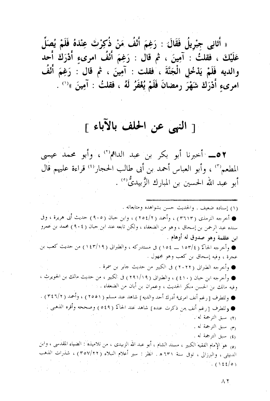 52 - أَخْبَرَنَا أَبُو بَكْرِ بْنُ عَبْدِ الدَّائِم وَأَبُو مُحَمَّد عِيسَى الْمطعم وَأَبُو الْعَبَّاسِ أَحْمَدُ بْنُ أَبِي طَالِبٍ الْحَجَّارُ قِرَاءَةً عَلَيْهِمْ قَالَ أَبُو عَبْدِ اللَّهِ الْحُسَيْنُ بْنُ الْمُبَارَكِ الزُّبَيْدِيُّ