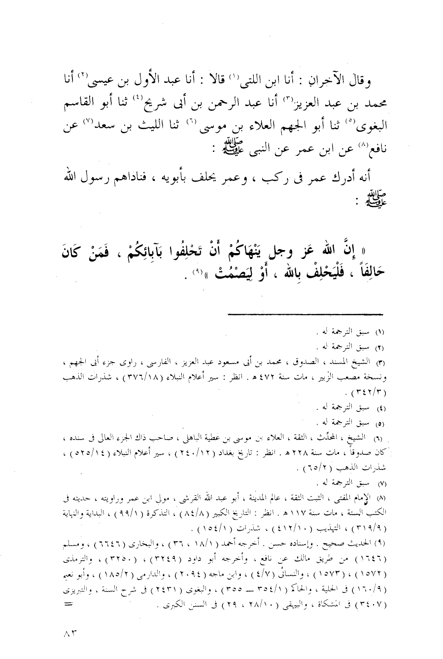 وَقَالَ الْآخَرَانِ أَنَا ابْنُ اللَّتِّيِّ قَالَا أَنَا عَبْدُ الْأَوَّلِ بْنُ عِيسَى أَنَا مُحَمَّدُ بْنُ عَبْدِ الْعَزِيزِ أَنَا عَبْدُ الرَّحْمَنِ بْنُ أَبِي شُرَيْحٍ ثَنَا أَبُو الْقَاسِمِ الْبَغَوِيُّ ثَنَا أَبُو الْجَهْمِ الْعَلَاءُ بْنُ مُوسَى ثَنَا اللَّيْثُ بْنُ سَعْدٍ عَنْ نَافِعٍ عَنِ ابْنِ عُمَرَ عَنِ النَّبِيِّ صَلَّى اللَّهُ عَلَيْهِ وَسَلَّمَ