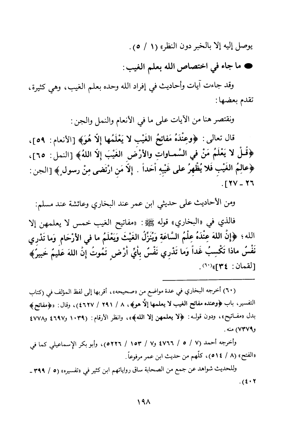 قال تعالى: {وَعِنْدَهُ مَفَاتِحُ الْغَيْبِ لَا يَعْلَمُهَا إِلَّا هُوَ} [الأنعام: 59]، {قُلْ لَا يَعْلَمُ مَنْ فِي السَّمَاوَاتِ وَالْأَرْضِ الْغَيْبَ إِلَّا اللَّهُ} [النمل: 65]، {عَالِمُ الْغَيْبِ فَلَا يُظْهِرُ عَلَى غَيْبِهِ أَحَدًا * إِلَّا مَنِ ارْتَضَى مِنْ رَسُولٍ} [الجن: 26 - 27].