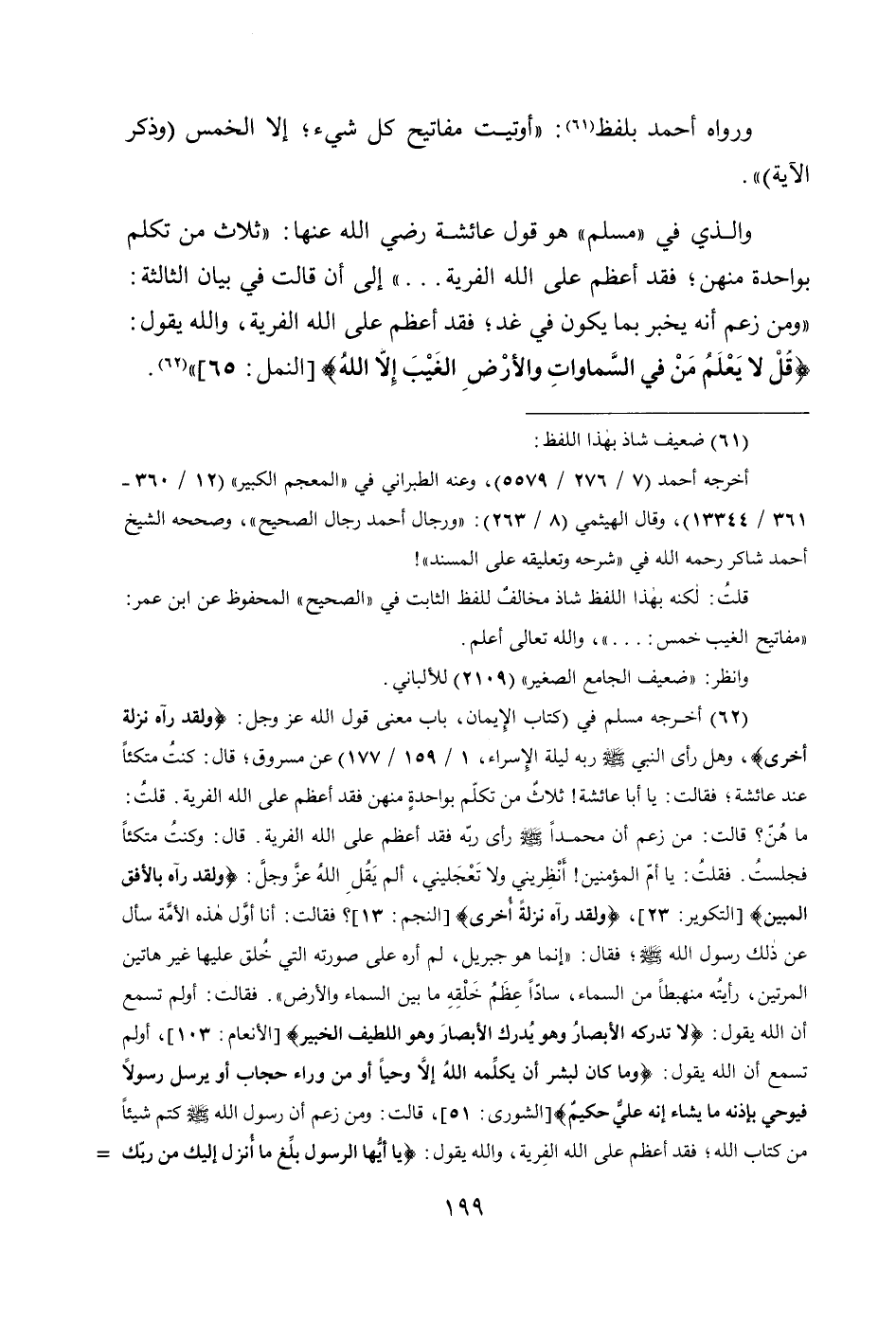 (¬62) أخرجه مسلم في (كتاب الإِيمان، باب معنى قول الله عز وجل: {وَلَقَدْ رَآهُ نَزْلَةً أُخْرَى}، وهل رأى النبي - صَلَّى اللهُ عَلَيْهِ وَسَلَّمَ - ربه ليلة الإِسراء، 1/ 159/ 177) عن مسروق؛ قال: كنتُ متكئاً عند عائشة، فقالت: يا أبا عائشة! ثلاثٌ من تكلّم بواحدةٍ منهن فقد أعظم على الله الفرية. قلتُ: ما هُنّ؛ قالت: من زعم أن محمداً - صَلَّى اللهُ عَلَيْهِ وَسَلَّمَ - رأى ربّه فقد أعظم على الله الفرية. قال: وكنتُ متكئاً فجلستُ. فقلتُ: يا أمّ المؤمنين! انظِريني ولا تَعْجَليني، ألم يَقُلِ اللهُ عزَّ وجلَّ: {وَلَقَدْ رَآهُ بِالْأُفُقِ الْمُبِينِ} [التكوير: 23]، {وَلَقَدْ رَآهُ نَزْلَةً أُخْرَى} [النجم: 13]؛ فقالت: أنا أوَّل هذه الأمَّة سأل عن ذلك رسول الله - صَلَّى اللهُ عَلَيْهِ وَسَلَّمَ -؛ فقال: " إنما هو جبريل، لم أره على صورته التي خُلق عليها غير هاتين المرتين، رأيتُه منهبطاً من السماء، سادّاً عِظَمُ خَلْقِهِ ما بين السماء والأرض ". فقالت: أولم تسمع أن الله يقول: {لَا تُدْرِكُهُ الْأَبْصَارُ وَهُوَ يُدْرِكُ الْأَبْصَارَ وَهُوَ اللَّطِيفُ الْخَبِيرُ} [الأنعام: 103]، أولم تسمع أن الله يقول: {وَمَا كَانَ لِبَشَرٍ أَنْ يُكَلِّمَهُ اللَّهُ إِلَّا وَحْيًا أَوْ مِنْ وَرَاءِ حِجَابٍ أَوْ يُرْسِلَ رَسُولًا فَيُوحِيَ بِإِذْنِهِ مَا يَشَاءُ إِنَّهُ عَلِيٌّ حَكِيمٌ} [الشورى: 51]، قالت: ومن زعم أن رسول الله - صَلَّى اللهُ عَلَيْهِ وَسَلَّمَ - كتم شيئاً من كتاب الله؛ فقد أعظم على الله الفِرية، والله يقول: {يَا أَيُّهَا الرَّسُولُ بَلِّغْ مَا أُنْزِلَ إِلَيْكَ مِنْ رَبِّكَ =