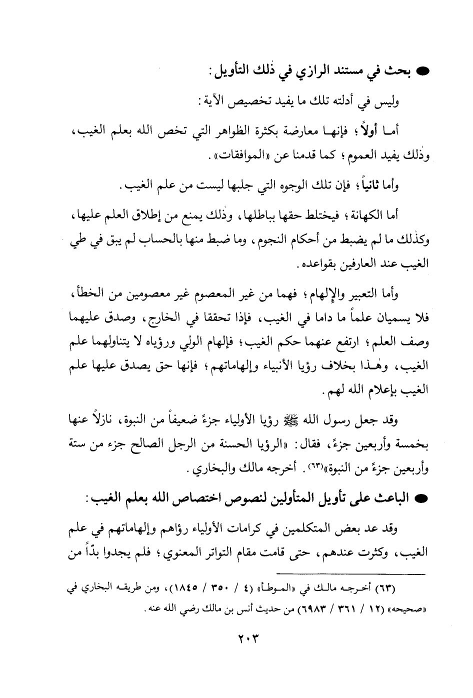 وأما التعبير والإِلهام؛ فهما من غير المعصوم غير معصومين من الخطأ، فلا يسميان علماً ما داما في الغيب، فإذا تحققا في الخارج، وصدق عليهما وصف العلم؛ ارتفع عنهما حكم الغيب، فإلهام الولي ورؤياه لا يتناولهما علم الغيب، وهذا بخلاف رؤيا الأنبياء وإلهاماتهم، فإنها حق يصدق عليها علم الغيب بإعلام الله لهم.