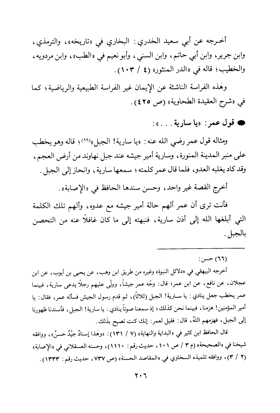 (¬66) حسن: أخرجه البيهقي في " دلائل النبوة " وغيره من طريق ابن وهب، عن يحى بن أيوب، عن ابن عجلان، عن نافع، عن ابن عمر؛ قال: وجّه عمر جيشاً، وولّى عليهم رجلًا يدعى سارية، فبينما عمر يخطب جعل ينادي: يا سارية! الجبل (ثلاثاً)، ثم قدم رسول الجيش فسأله عمر، فقال: يا أمير المؤمنين! هزمنا، فبينما نحن كذلك؛ إذ سمعنا صوتاً ينادي: يا سارية! الجبل، فأسندنا ظهورنا إلى الجبل، فهزمهم اللهً، قال: فقيل لعمر: إنك كنت تصيح بذلك.