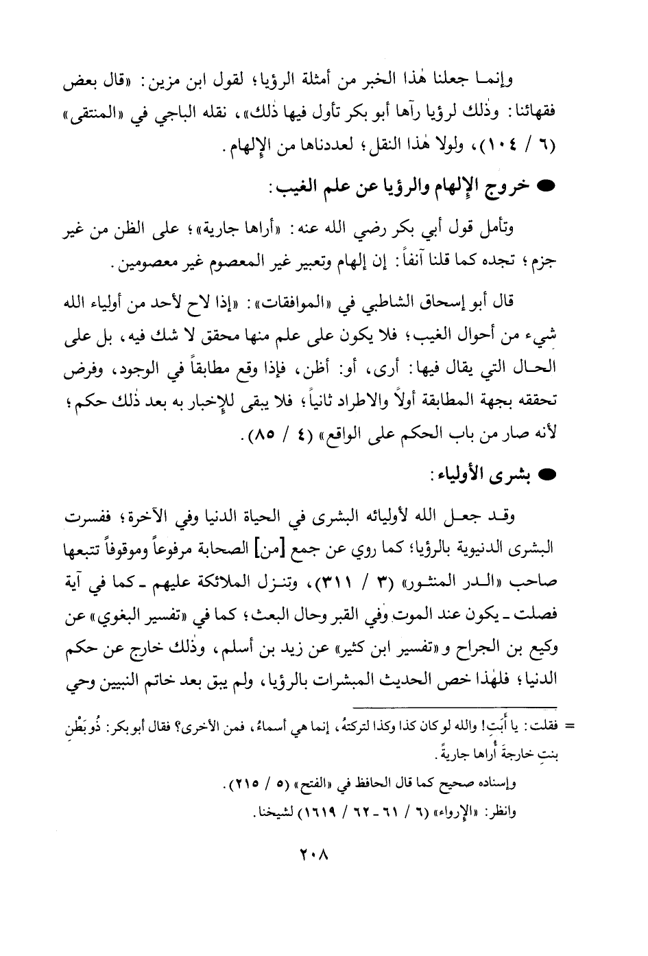 وإنما جعلنا هذا الخبر من أمثلة الرؤيا، لقول ابن مزين: " قال بعض فقهائنا: وذلك لرؤيا رآها أبو بكر تأول فيها ذلك "، نقله الباجي في " المنتقى " (6/ 104)، ولولا هذا النقل، لعددناها من الإِلهام.