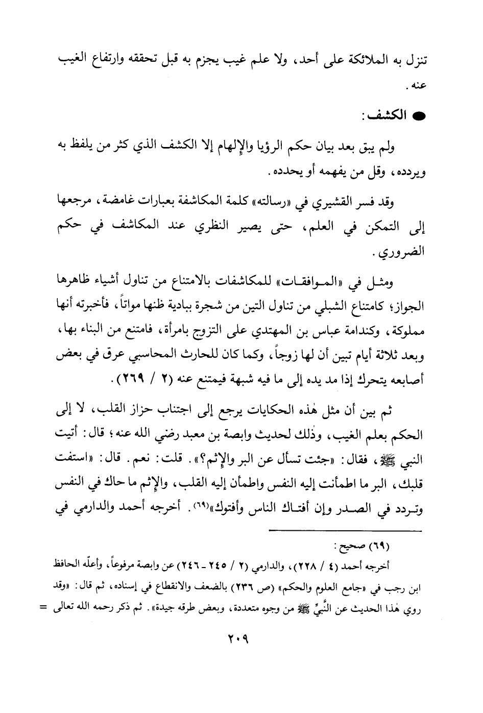 ثم بين أن مثل هذه الحكايات يرجع إلى اجتناب حزاز القلب، لا إلى الحكم بعلم الغيب، وذلك لحديث وابصة بن معبد رضي الله عنه؛ قال: أتيت النبي - صَلَّى اللهُ عَلَيْهِ وَسَلَّمَ -، فقال: «جِئْتَ تَسْأَلُ عَنِ الْبِرِّ وَالإِثْمِ؟». قُلْتُ: نَعَمْ. قَالَ: «اسْتَفْتِ قَلْبَكَ، الْبِرُّ مَا اطْمَأَنَّتْ إِلَيْهِ النَّفْسُ وَاطْمَأَنَّ إِلَيْهِ الْقَلْبُ، وَالْإِثْمُ مَا حَاكَ فِي النَّفْسِ وَتَرَدَّدَ فِي الصَّدْرِ وَإِنْ أَفْتَاكَ النَّاسُ وَأَفْتَوْكَ» (¬69). أخرجه أحمد والدارمي في