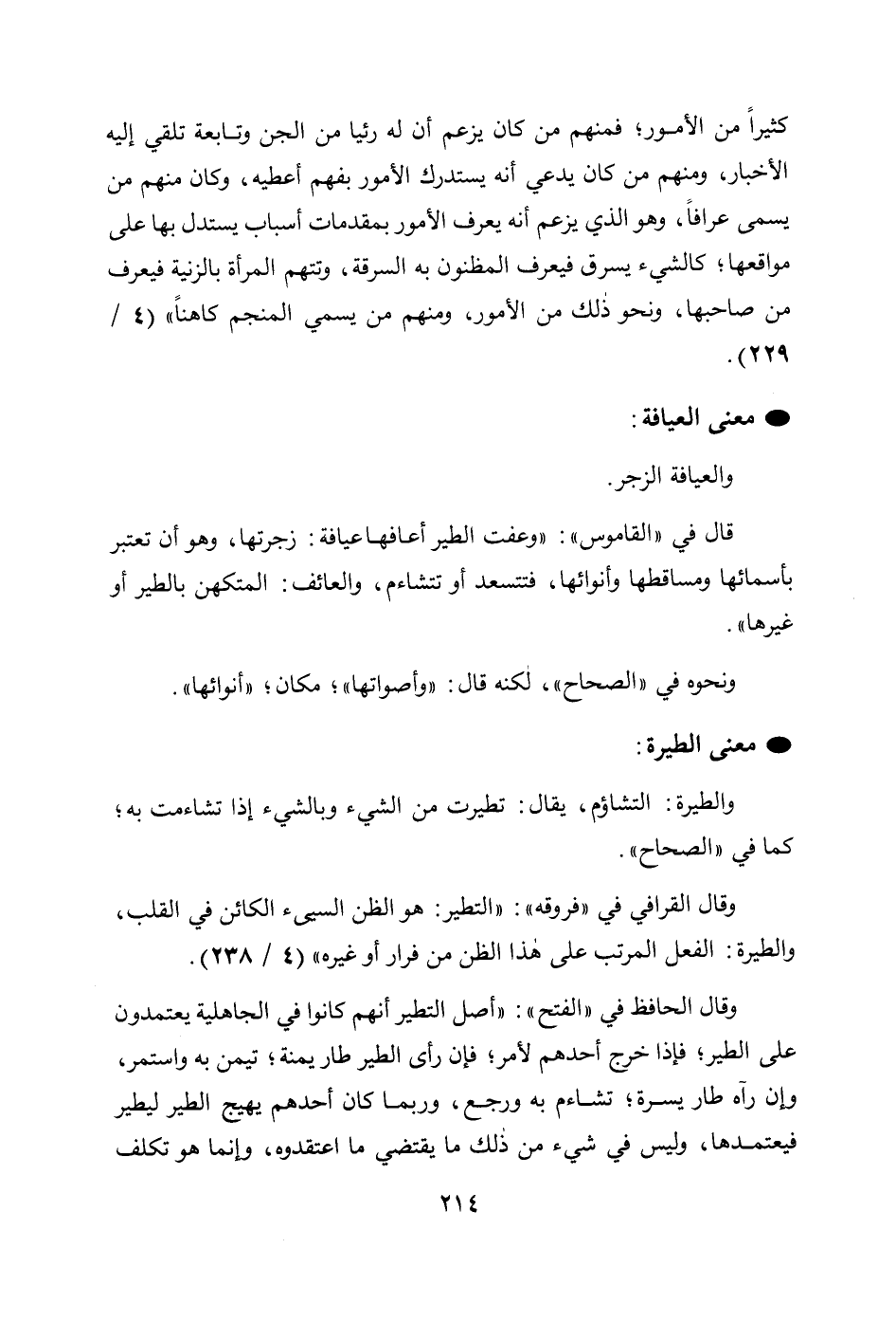 قال في " القاموس ": " وعفت الطير أعافها عيافة: زجرتها، وهو أن تعتبر بأسمائها ومساقطها وأنوائها، فتتسعد أو تتشاءم، والعائف: المتكهن بالطير أو غيرها ".