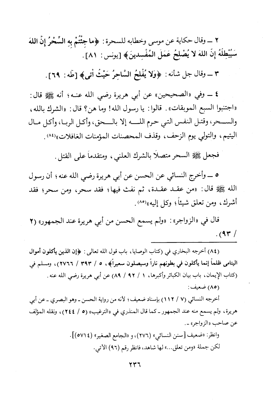 4 - وفي " الصحيحين " عن أبي هريرة رضي الله عنه؛ أنه - صَلَّى اللهُ عَلَيْهِ وَسَلَّمَ - قَالَ: «اجْتَنِبُوا السَّبْعَ الْمُوبِقَاتِ». قَالُوا: يَا رَسُولَ اللهِ! وَمَا هُنَّ؛ قال: «الشِّرْكُ بِاللهِ، وَالسِّحْرُ، وَقَتْلُ النَّفْسِ الَّتي حَرَّمَ اللهُ إِلاَّ بِالْحَقِّ، وَأَكْلُ الرِّبَا، وَأَكْلُ مَالِ الْيَتِيمِ، وَالتَّوَلِّي يَوْمَ الزَّحْفِ، وَقَذْفُ الْمُحْصَنَاتِ الْمُؤْمِنَاتِ الْغَافِلاَتِ» (¬84).