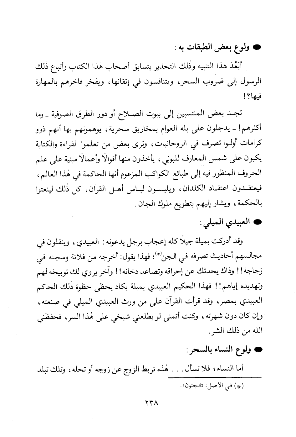 تجد بعض المنتسبين إلى بيوت الصلاح أو دور الطرق الصوفية- وما أكثرهم! - يدجلون على بله العوام بمخاريق سحرية، يوهمونهم بها أنهم ذوو كرامات أولوا تصرف في الروحانيات، وترى بعض من تعلموا القراءة والكتابة يكبون على شمس المعارف للبوني، يأخذون منها أقوالاً وأعمالًا مبنية على علم الحروف المنظور فيه إلى طبائع الكواكب المزعوم أنها الحاكمة في هذا العالم، فيعتقدون اعتقاد الكلدان، ويلبسون لباس أهل القرآن، كل ذلك لينعتوا بالحكمة، ويشار إليهم بتطويع ملوك الجان.