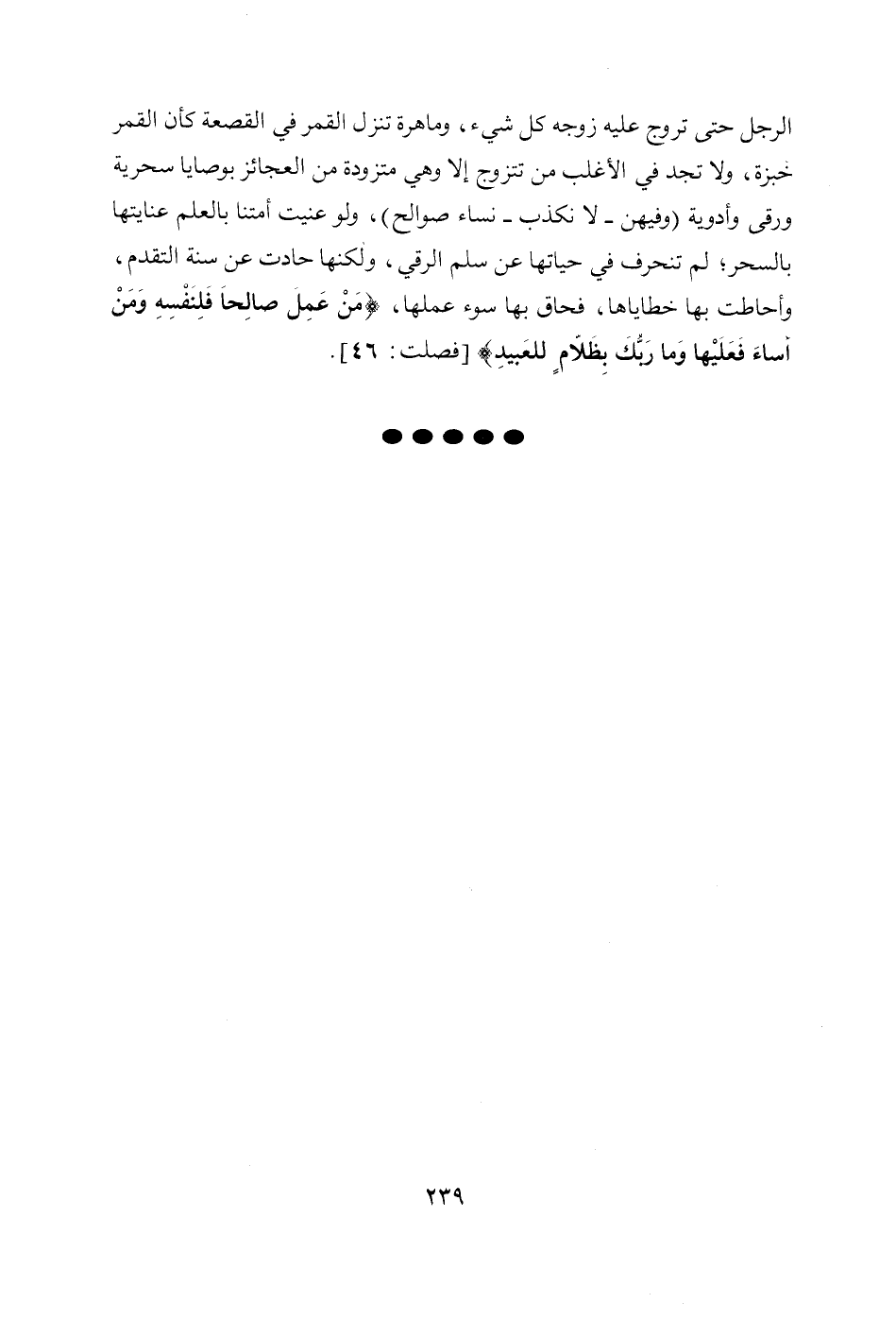 الرجل حتى تروج عليه زوجه كل شيء، وماهرة تنزل القمر في القصعة كأن القمر خبزة، ولا تجد في الأغلب من تتزوج إلا وهي متزوده من العجائز بوصايا سحرية ورقى وأدوية (وفيهن- لا نكذب- نساء صوالح)، ولو عنيت أمتنا بالعلم عنايتها بالسحر، لم تنحرف في حياتها عن سلم الرقي، ولكنها حادت عن سنة التقدم، وأحاطت بها خطاياها، فحاق بها سوء عملها، {مَنْ عَمِلَ صَالِحًا فَلِنَفْسِهِ وَمَنْ أَسَاءَ فَعَلَيْهَا وَمَا رَبُّكَ بِظَلَّامٍ لِلْعَبِيدِ} [فصلت: 46].