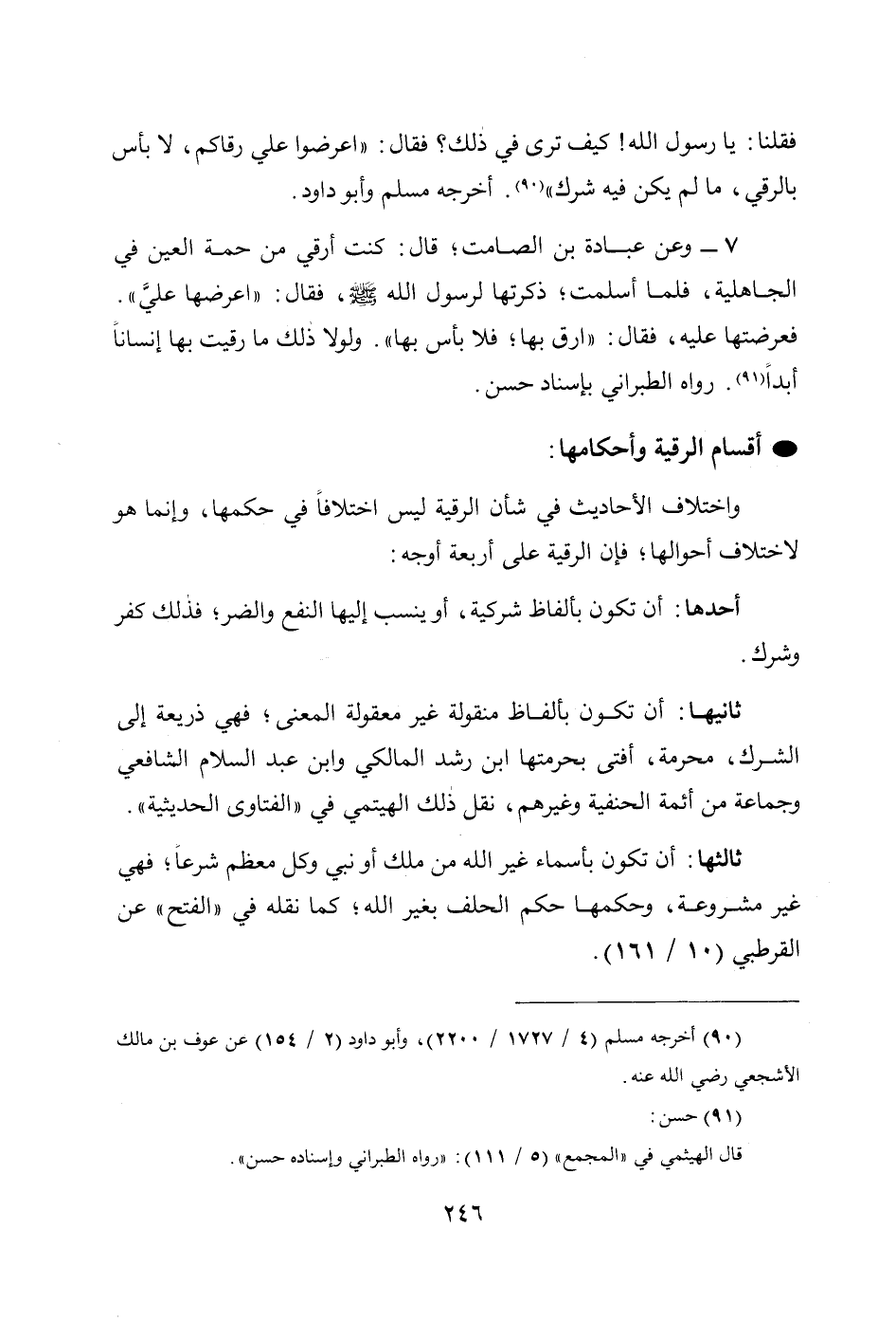 فقلنا: يا رسول الله! كيف ترى في ذلك؛ فقال: «اعْرِضُوا عَلَيَّ رُقَاكُمْ، لَا بَأْسَ بِالرُّقَى، مَا لَمْ يَكُنْ فِيهِ شِرْكٌ» (¬90). أخرجه مسلم وأبوداود.